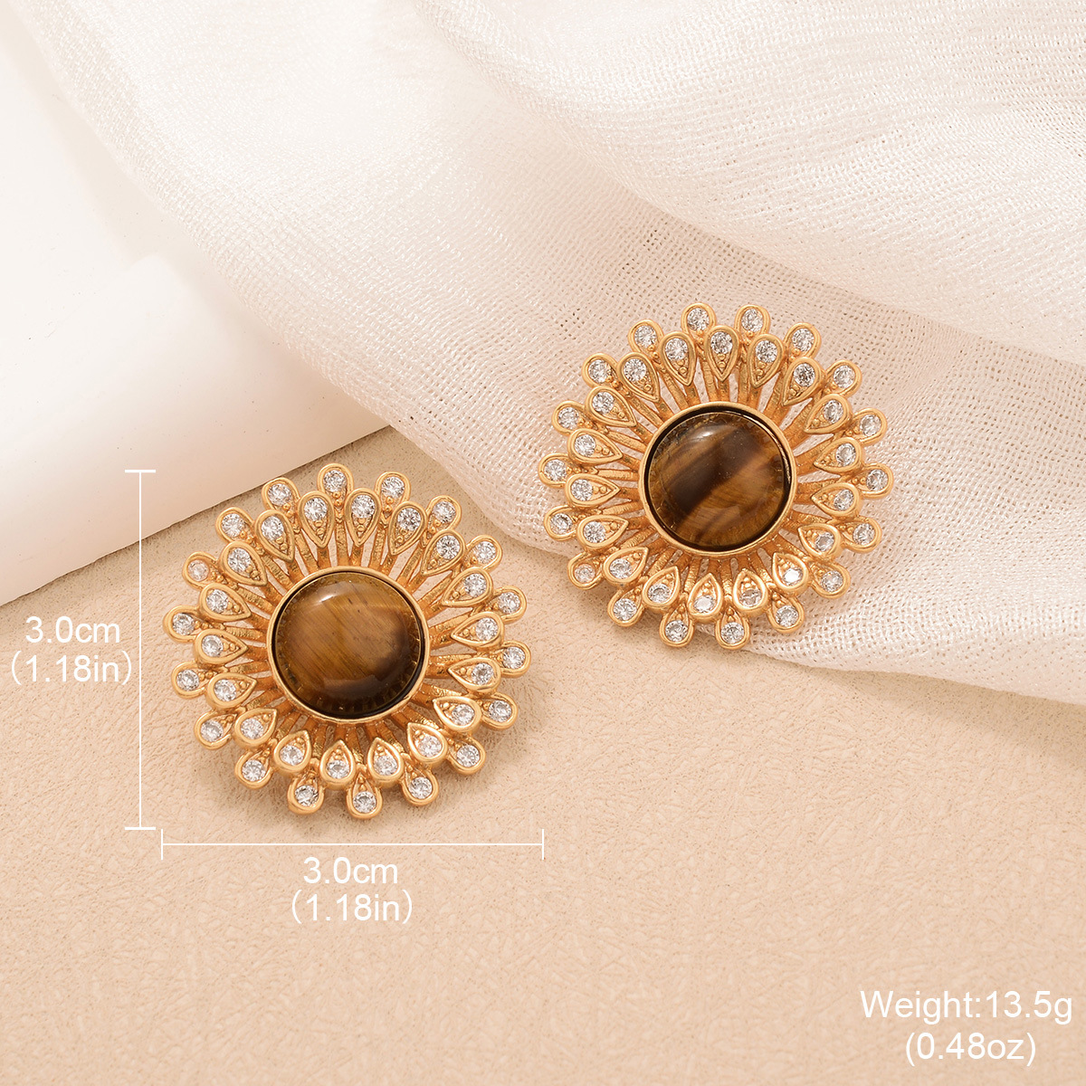Tiger eye earrings, Maillard earrings, Hong Kong-style retro high-end round face slimming, light luxury sunflower design autumn and winter earrings