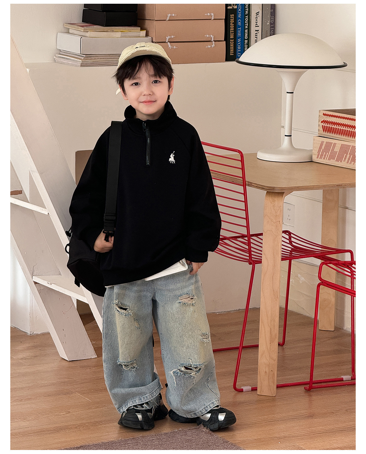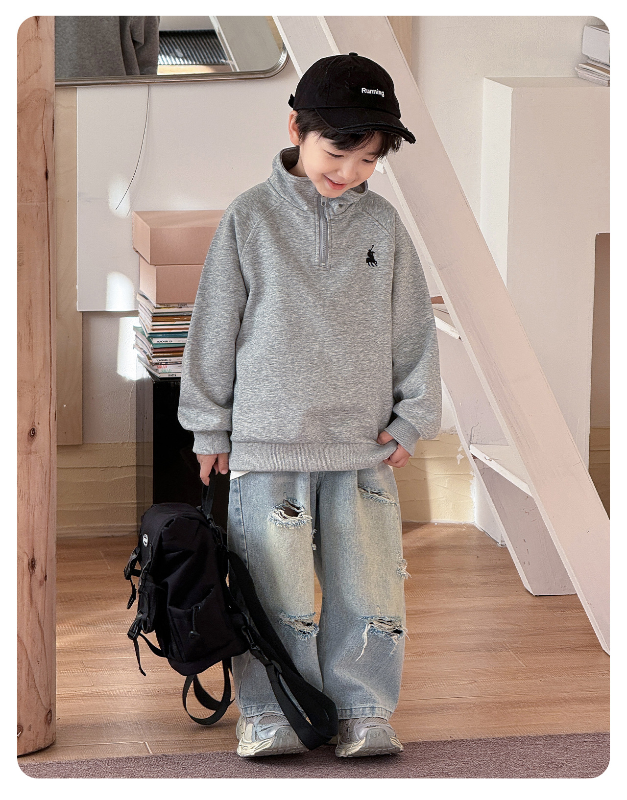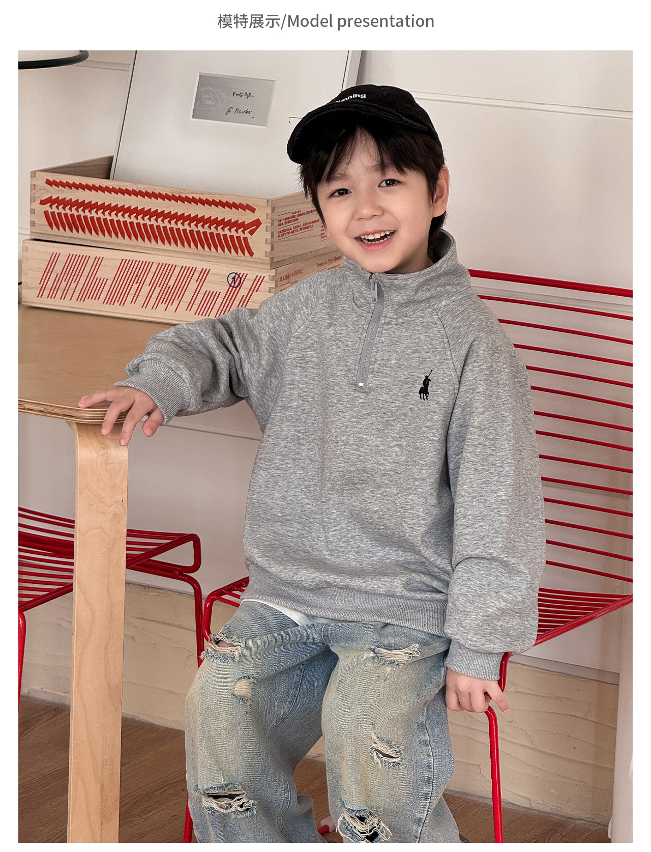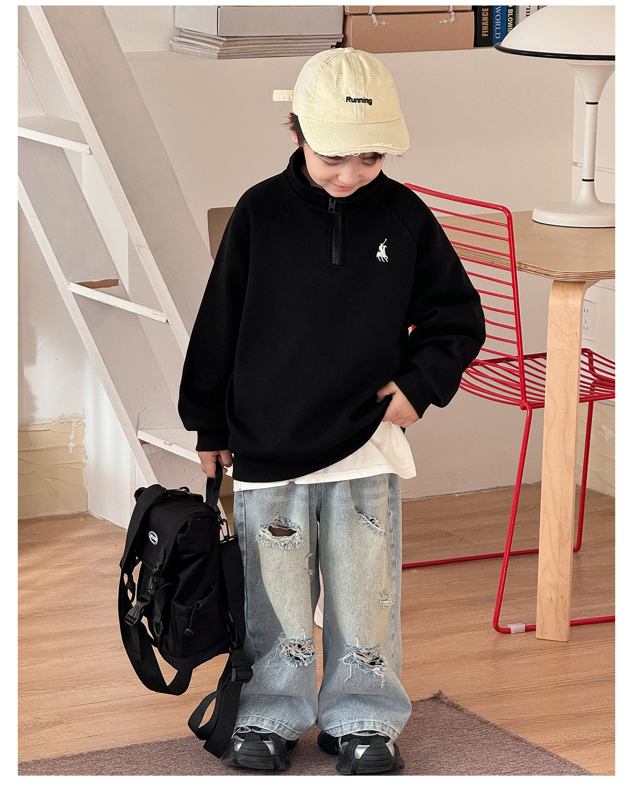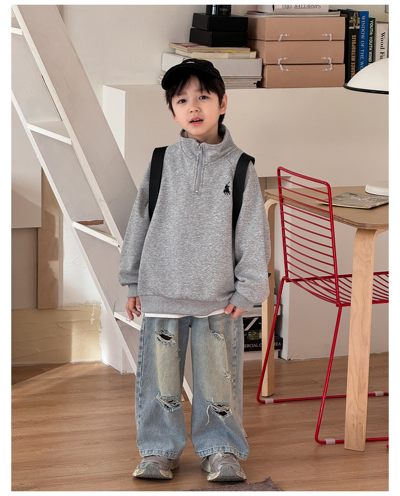 Tongku 2025 Spring Collection of Huzhou Zhili Children's Clothing: Fashionable embroidered top, stand-up collar, zipper, solid color children's hoodie