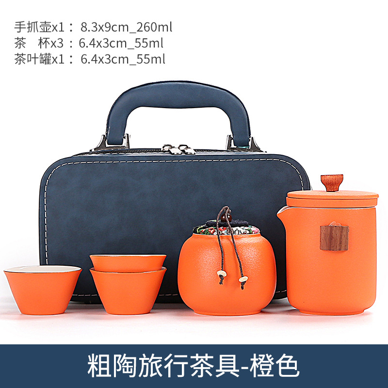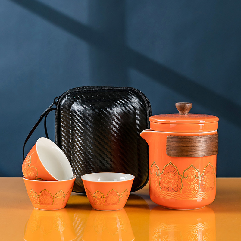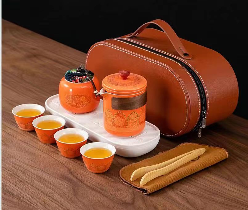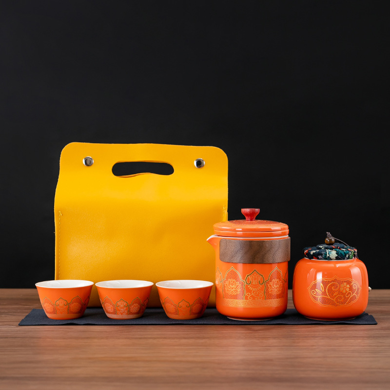 Ancient Charm Orange Oval Brown bag + four cups + tea canister + tray