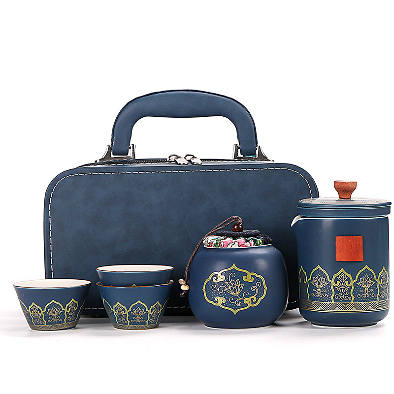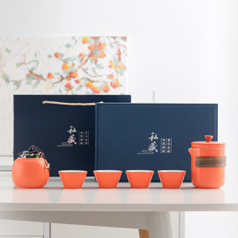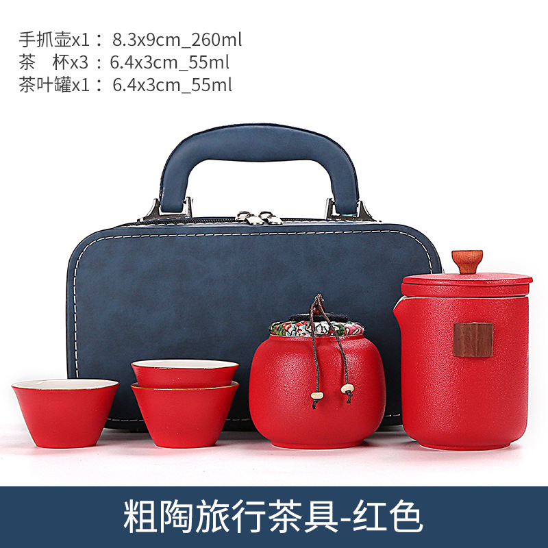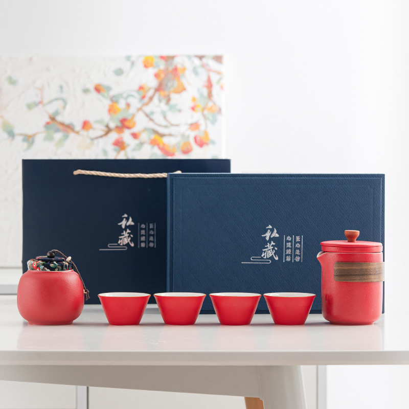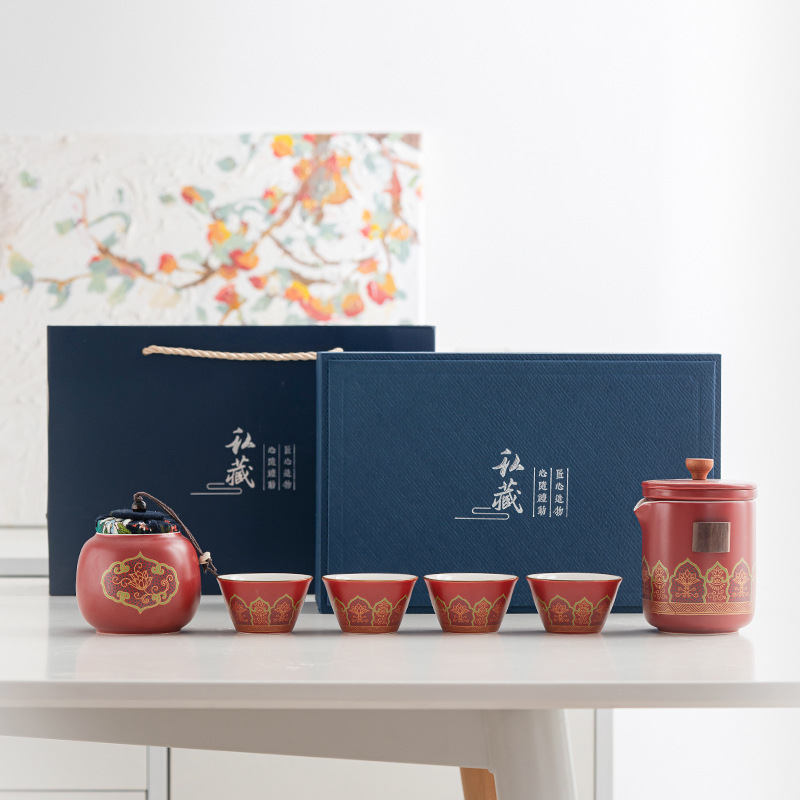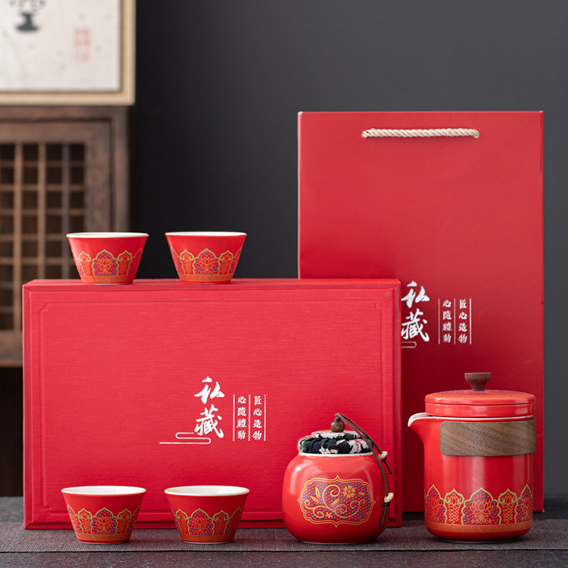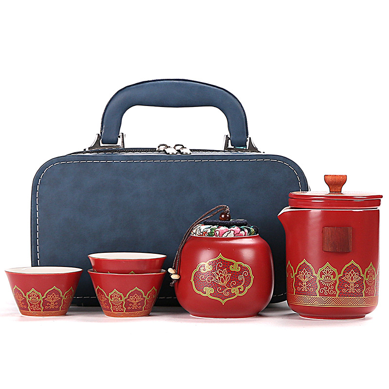 Ancient Charm Red Oval brown bag + four cups + tea canister + tray