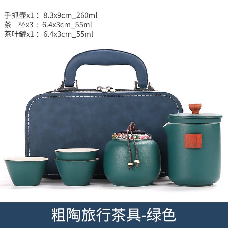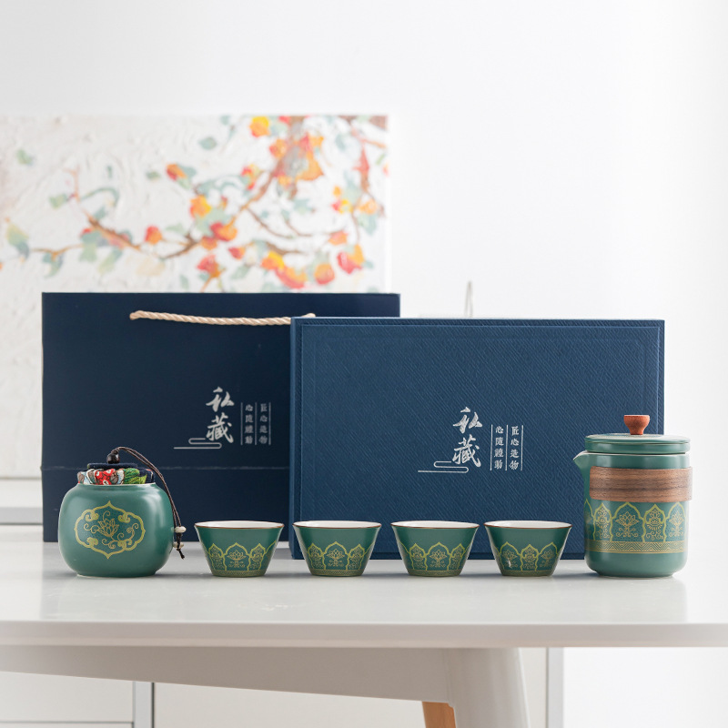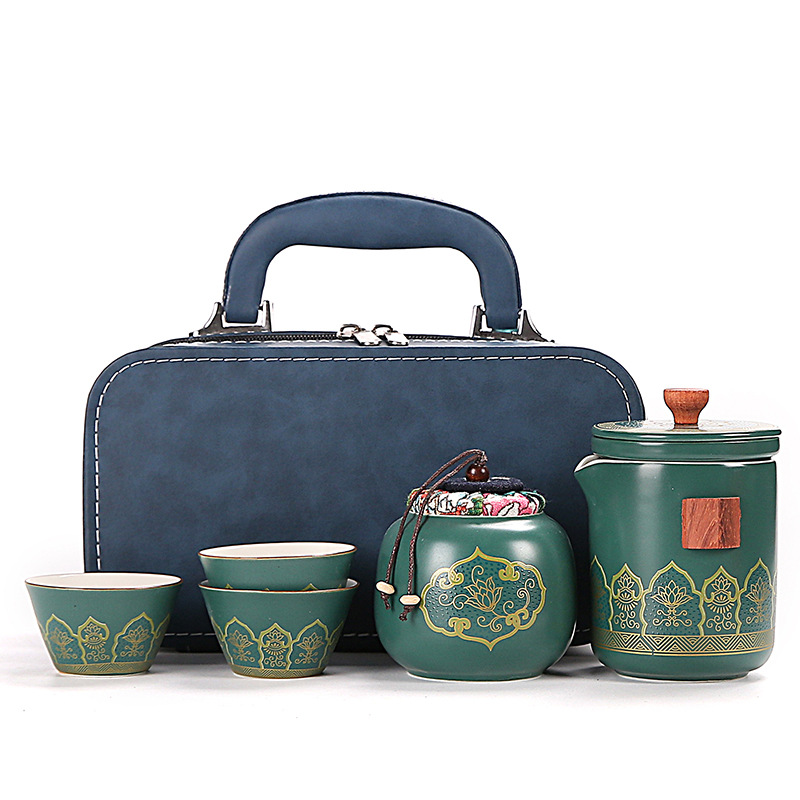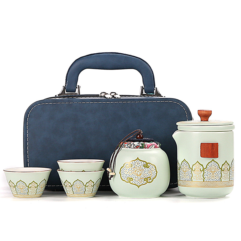 Ancient charm green oval brown bag + four cups + tea canister + tray