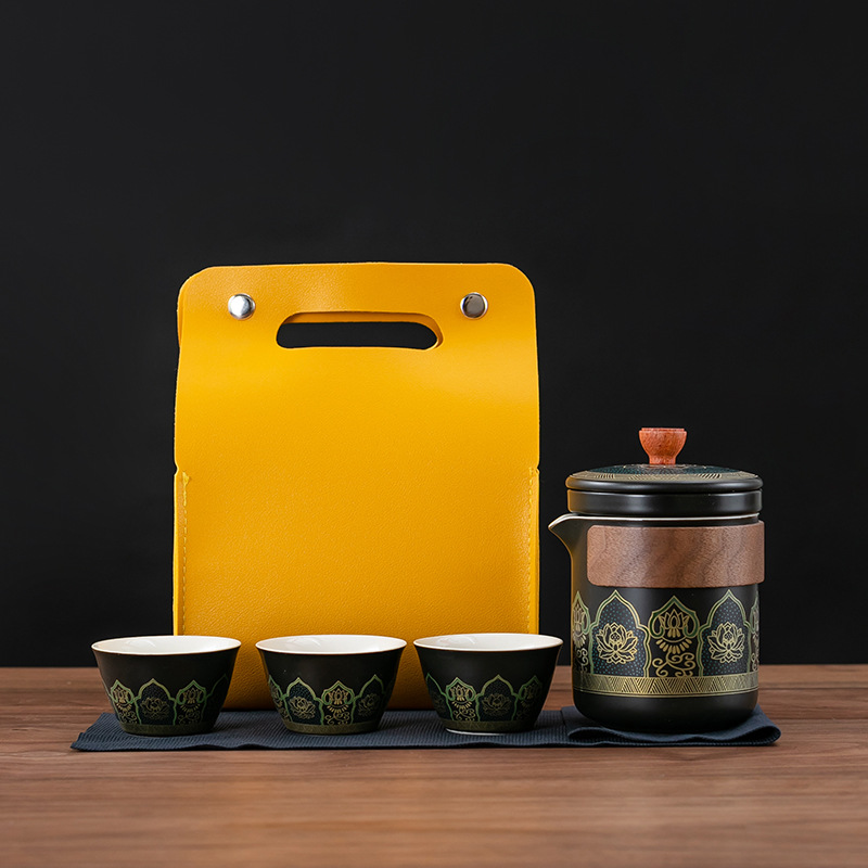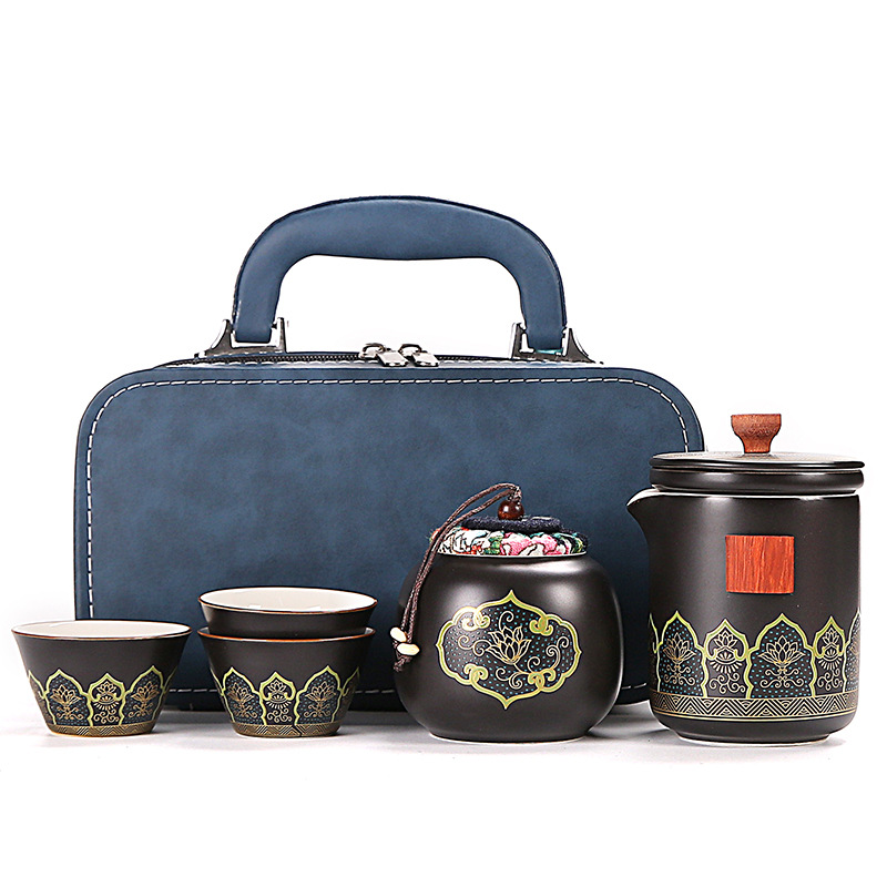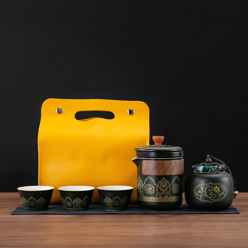 Ancient charm black oval brown bag + four cups + tea canister + tray