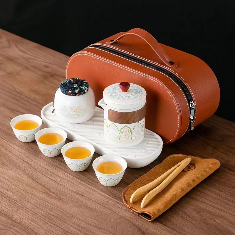 Ancient-style white oval brown bag + four cups + tea canister + tray
