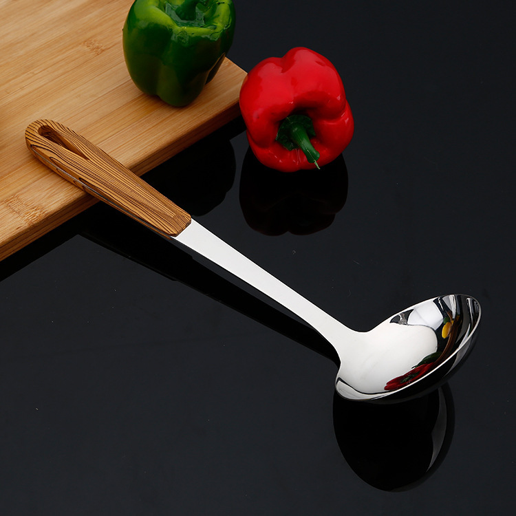 Two-piece set of stainless steel 3-centimeter-thick wood-grain handle cooking spatula and colander