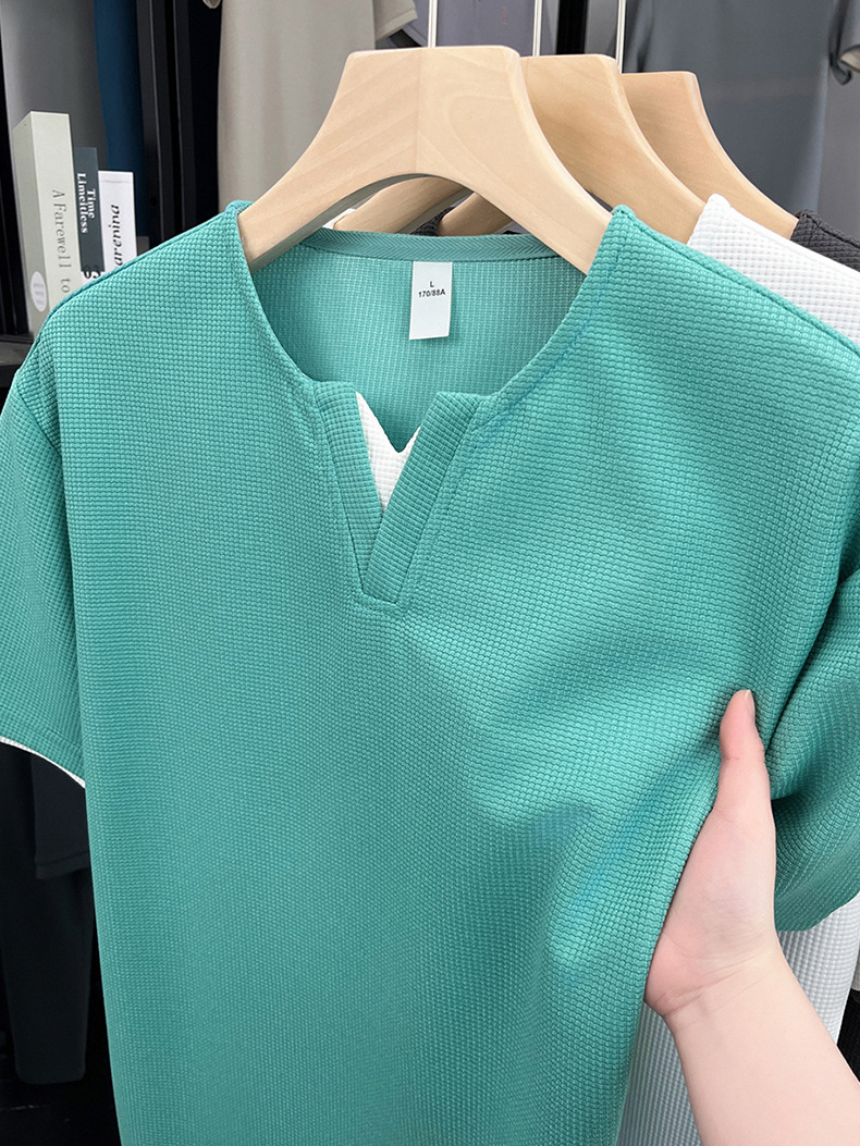 Two V-neck men's T-shirts for summer, a new style of youth fashion and casual solid-color net waffle short-sleeved men's T-shirt