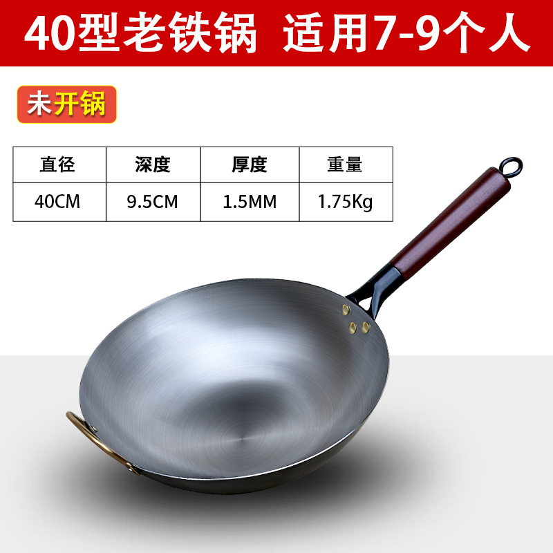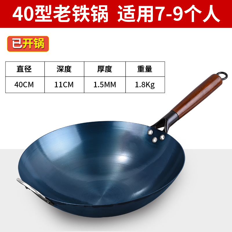 40cm [Round bottom without ears] 1.5 thick wooden-handled iron pot [Hand-cooked