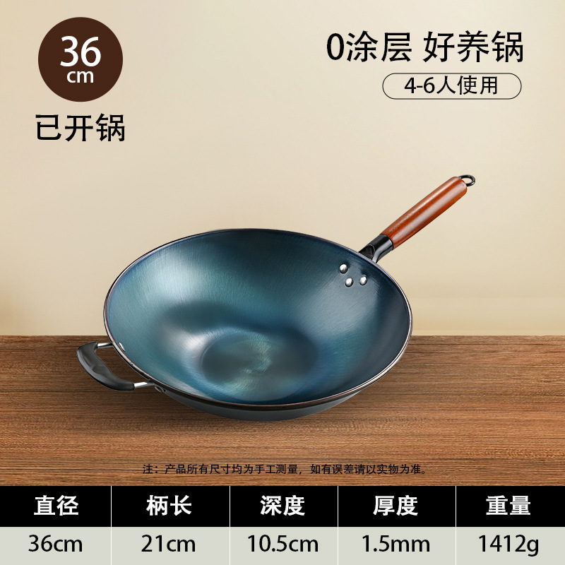 36cm [Round bottom without ears] 1.5 thick wooden handle iron pot [Hand-cooked]