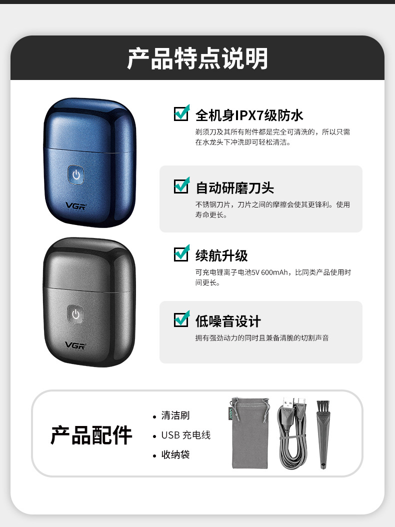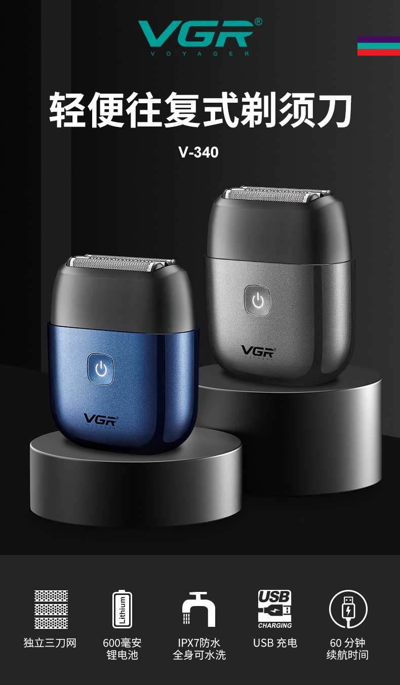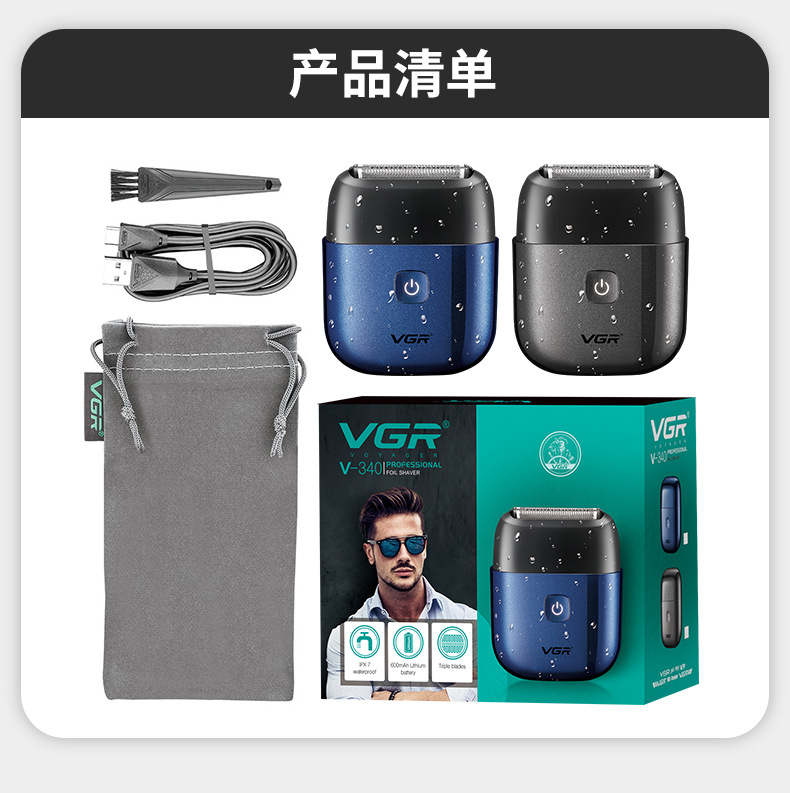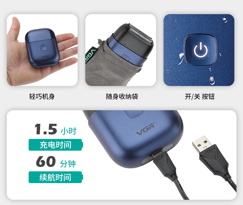 VGR340 Portable reciprocating shaver, electric men's travel mini full-body waterproof automatic grinding razor