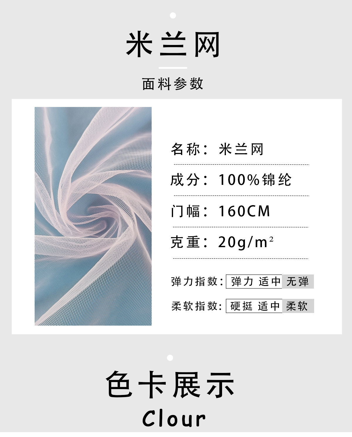 We offer a variety of colors of Milan mesh soft nylon rhombic mesh fabric, mesh fabric for women's and children's clothing and skirts