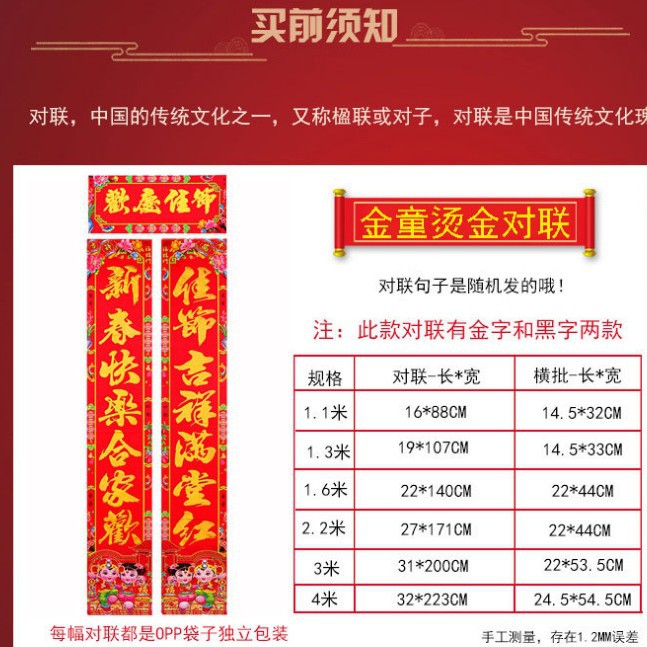 Note: The length of the Spring Festival couplets is a market term. The actual size of the vertical couplets (excluding the horizontal ones) may vary due to different styles and layouts.
