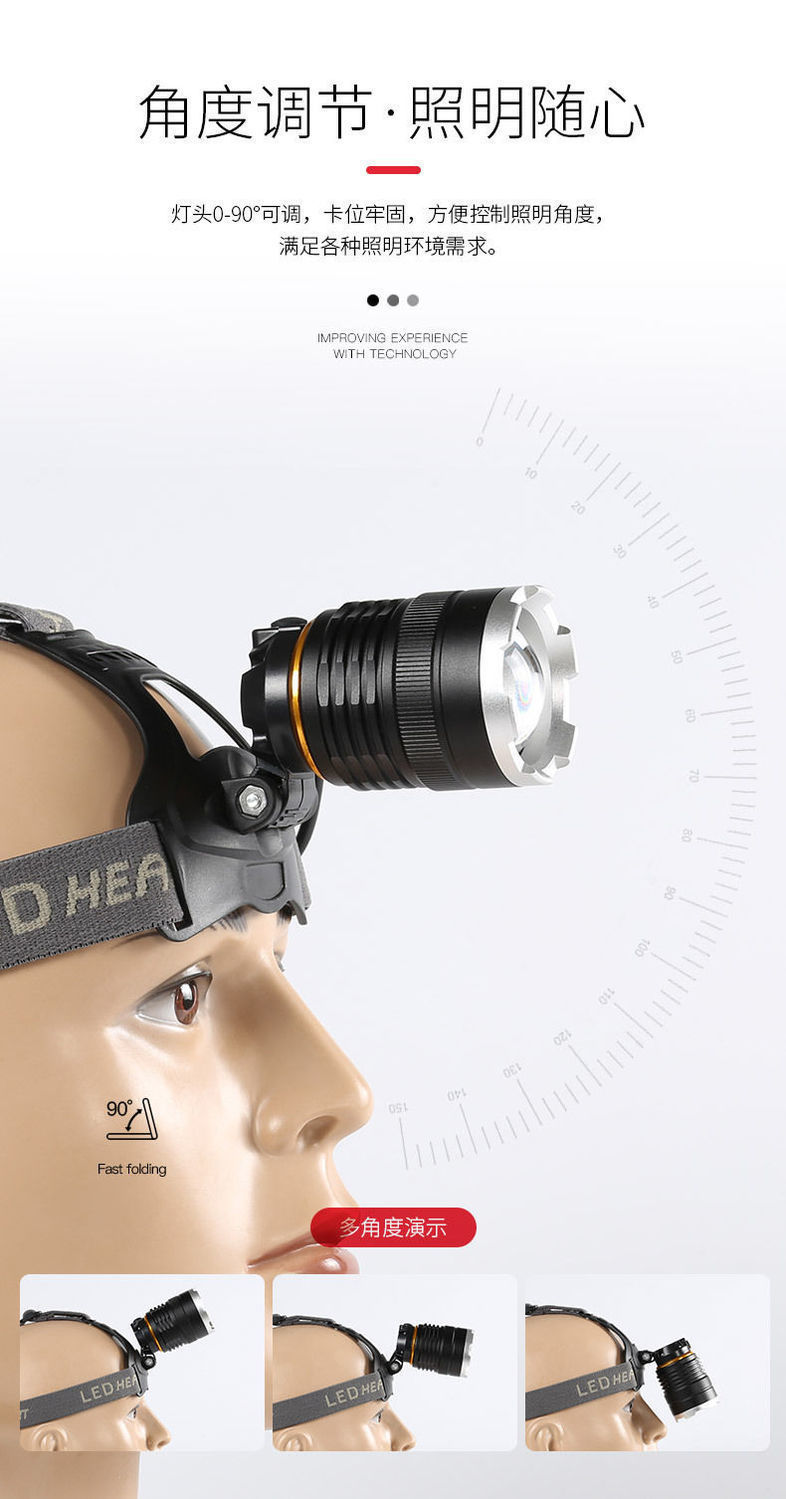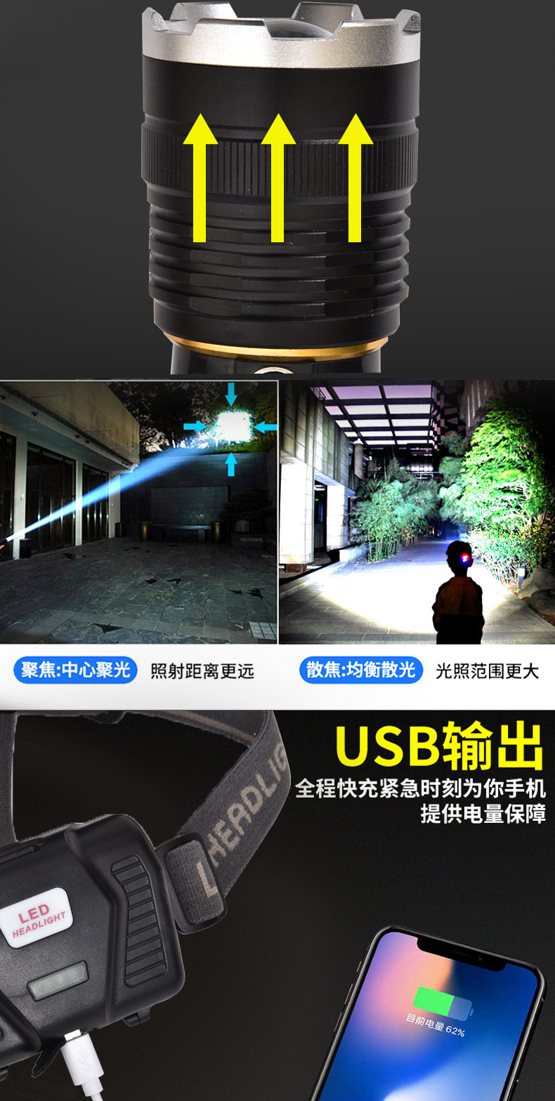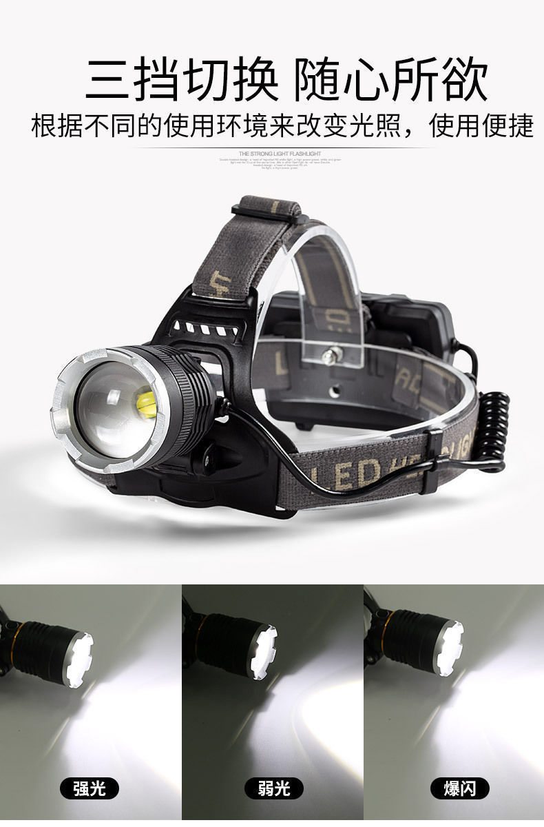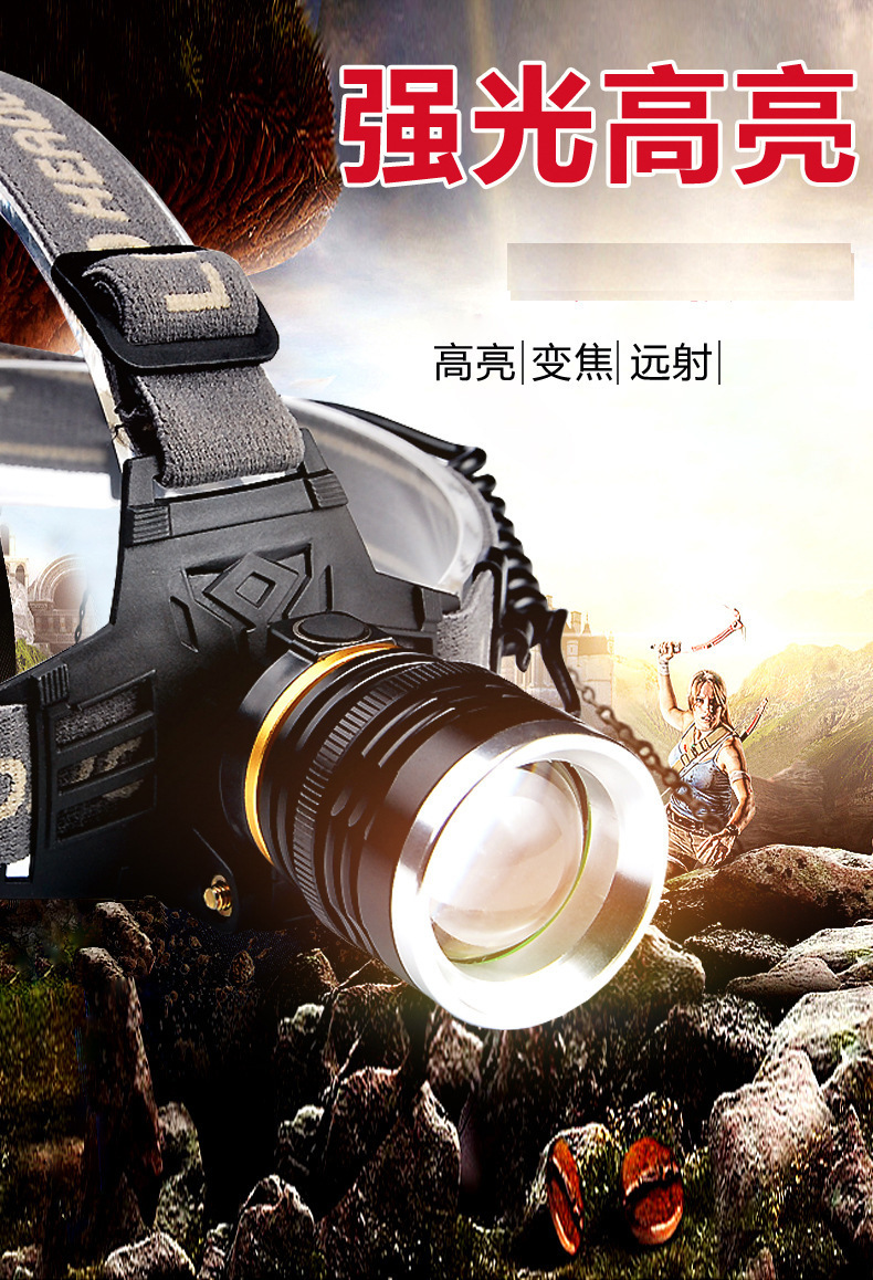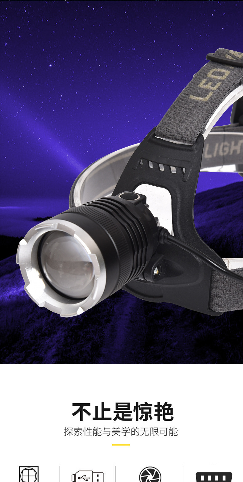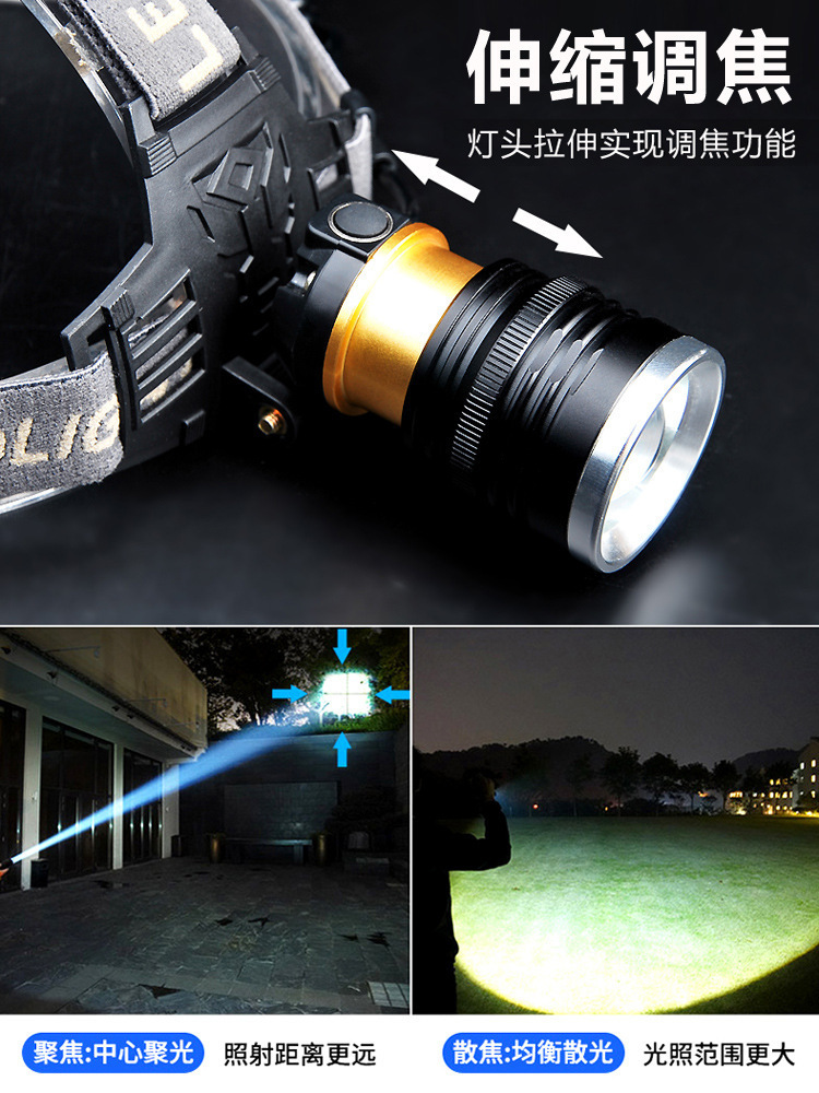 White laser zoom headlamp, high-intensity charging head-mounted long-range miner's lamp, LED fishing lighting flashlight P70 for both outdoor and indoor use