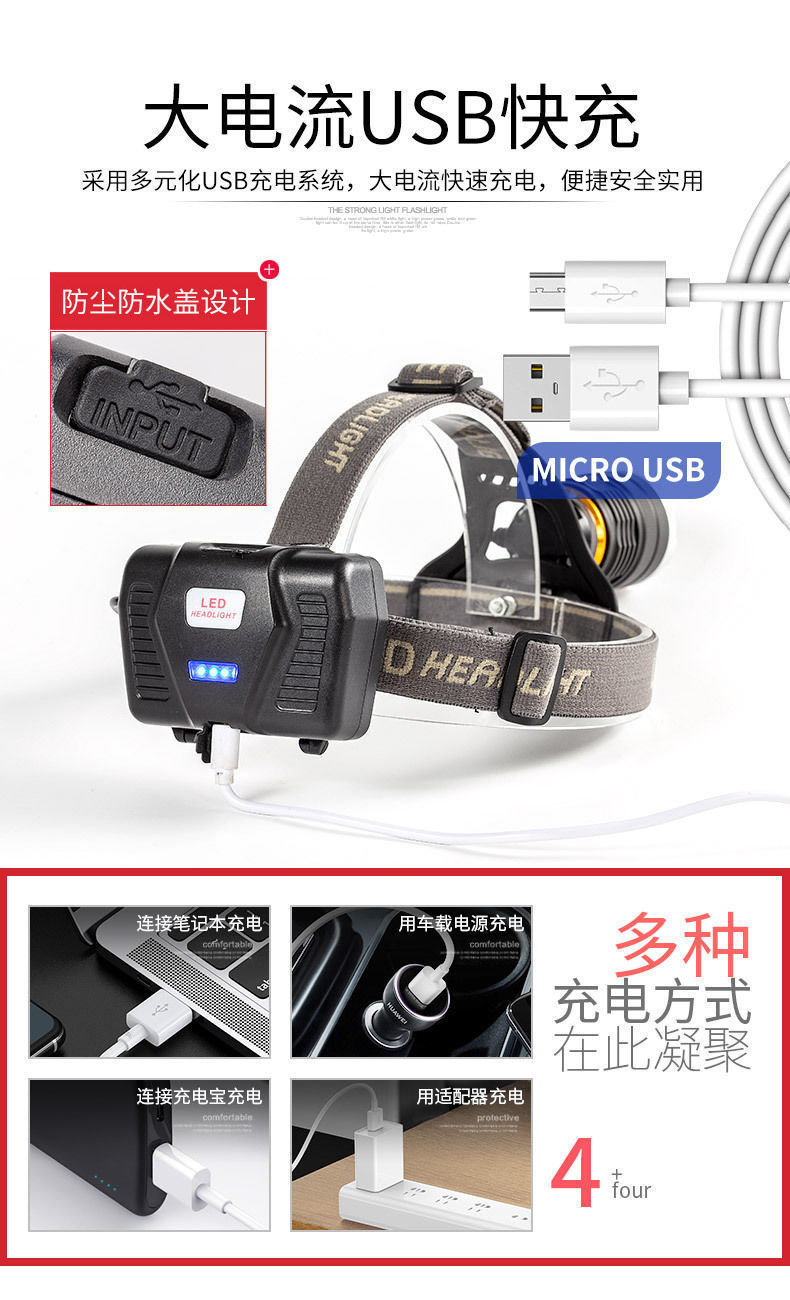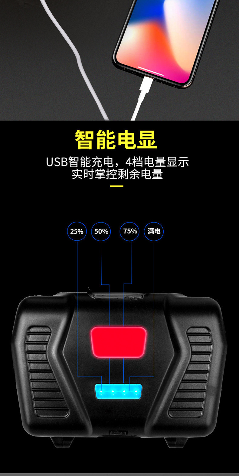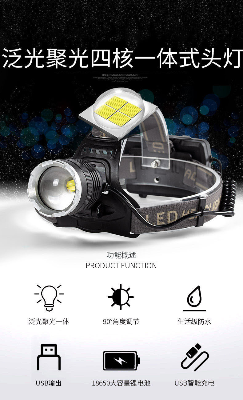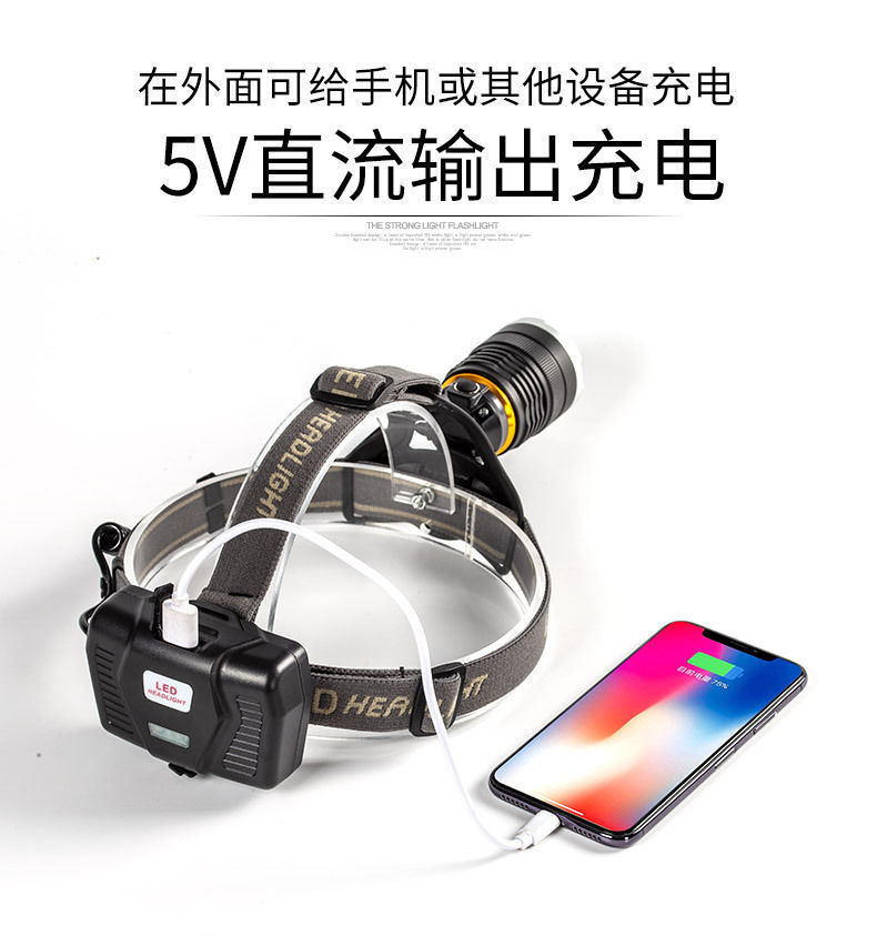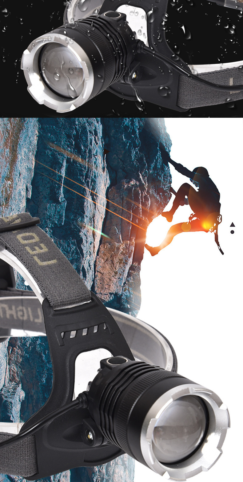 White laser zoom headlamp, high-intensity charging head-mounted long-range miner's lamp, LED fishing lighting flashlight P70 for both outdoor and indoor use