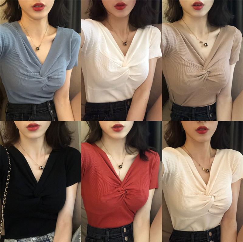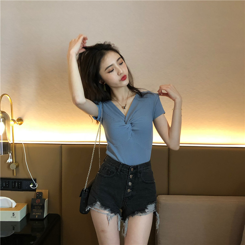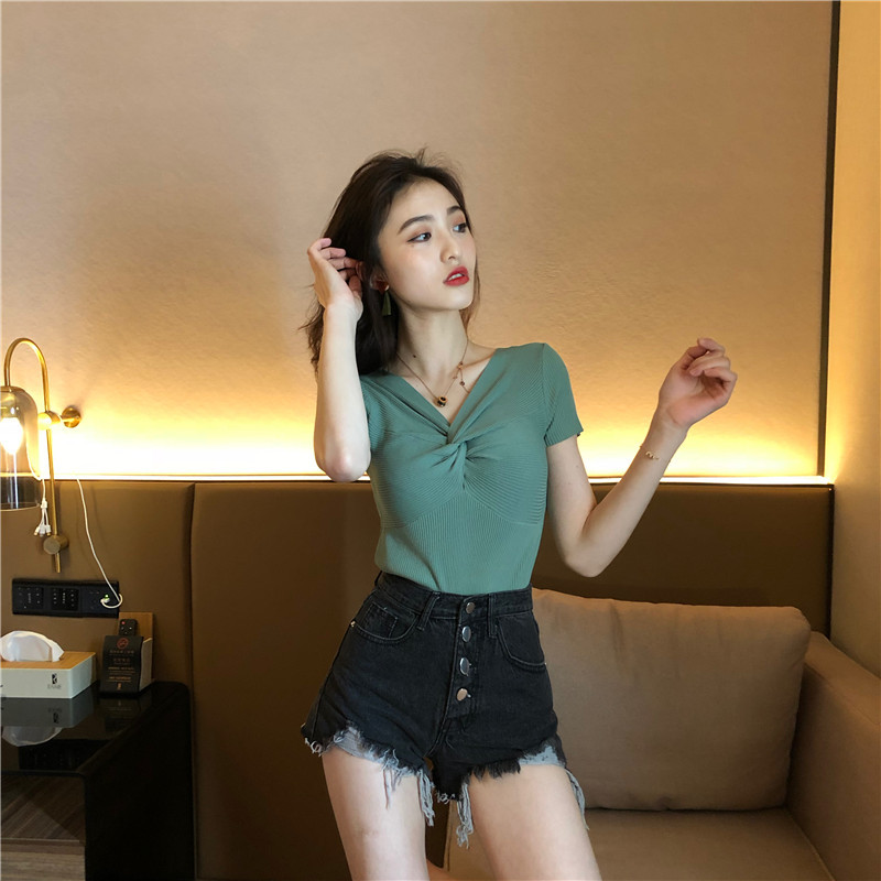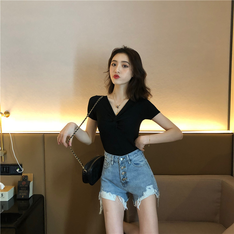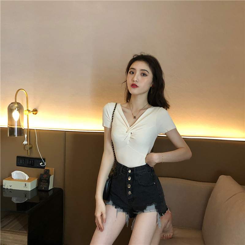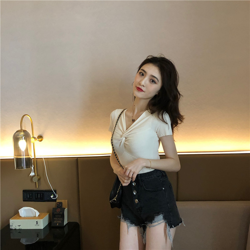 White T-shirt, women's short-sleeved, ins, stylish, cross-knotted V-neck, slimming, little trick, base layer top, 2021 summer trend