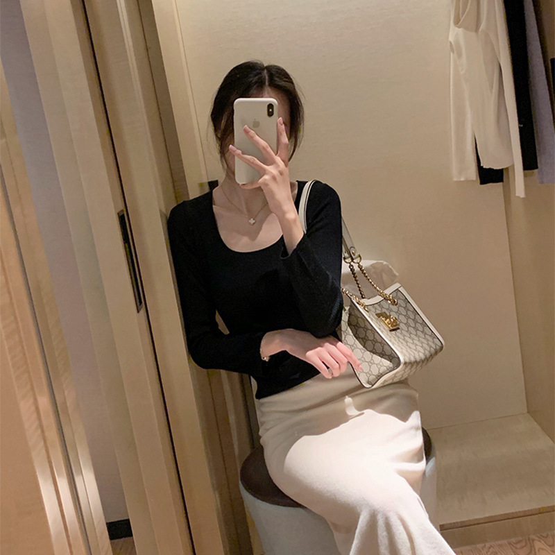 Women's autumn and winter knitted sweater, women's spring and autumn U-neck long-sleeved wool sweater, slimming, sexy and gentle style pullover top