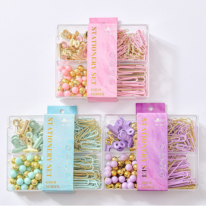 Wholesale macaron-colored paper clips of various sizes, cultural and creative office sets, mixed gold thumbtacks, ticket holders, binding and storage stationery