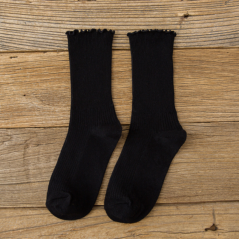 Wholesale of Chayanne's new Japanese-style solid-color pile socks, black fungus lace loose cotton socks for women, and mid-calf socks from the sock manufacturer