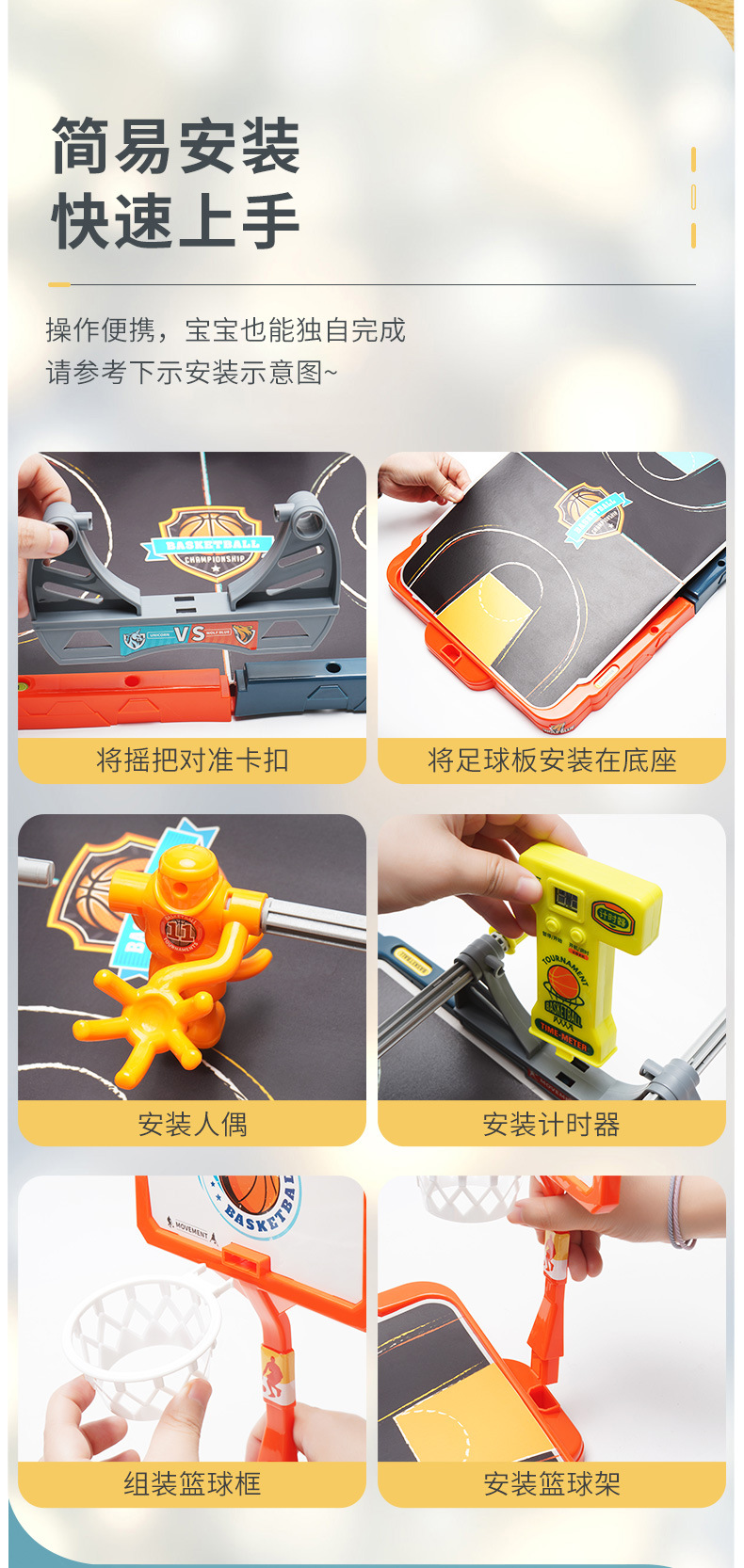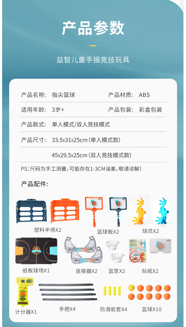 | 10 singles + timer (mail-order box) | 35.6 * 5.3 * 32.1 | 673g | Blue, orange | * 1 * 1 + + basketball board plastic field player * * 1 + 1 + cardboard field connector basket * * 2 + 2 + stickers * 2 * 2 + the antiskid rubber sleeve + hand * * 1 * 10 + 2 + basketball timepieces | |||
