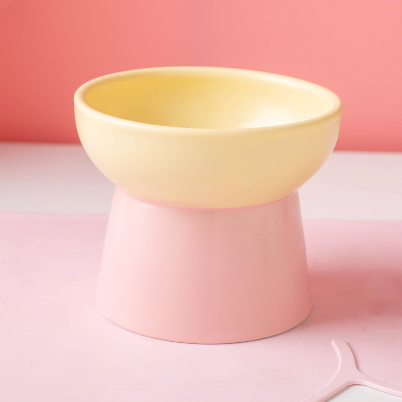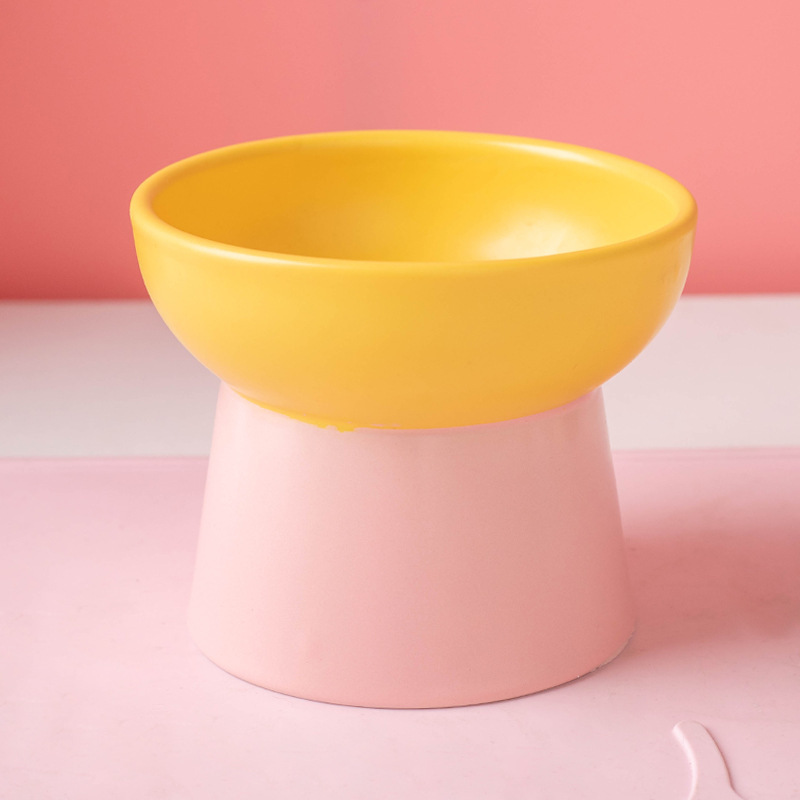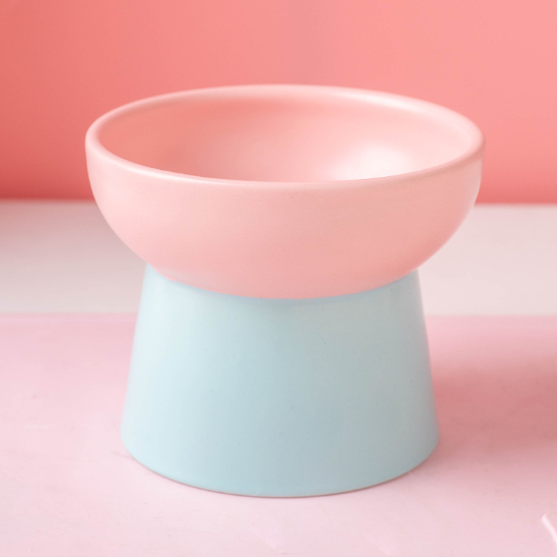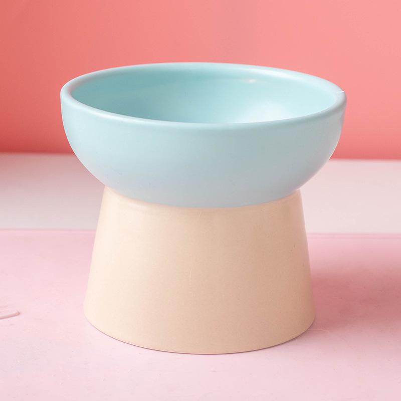 Wholesale of color-blocking ceramic cat bowls with high legs to protect the cervical vertebrae, cat food bowls, cat and dog basins, drinking bowls, and pet snack bowls