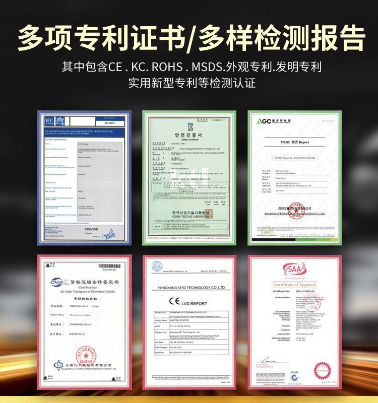 The chargers have certifications such as CE and rohs.