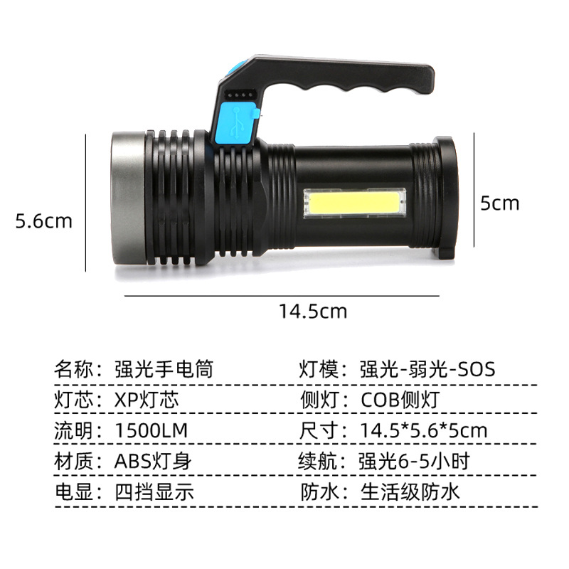 Wholesale of cross-border usb charging, side home led multi-functional COB flashlight, outdoor long-range electric display portable lamp
