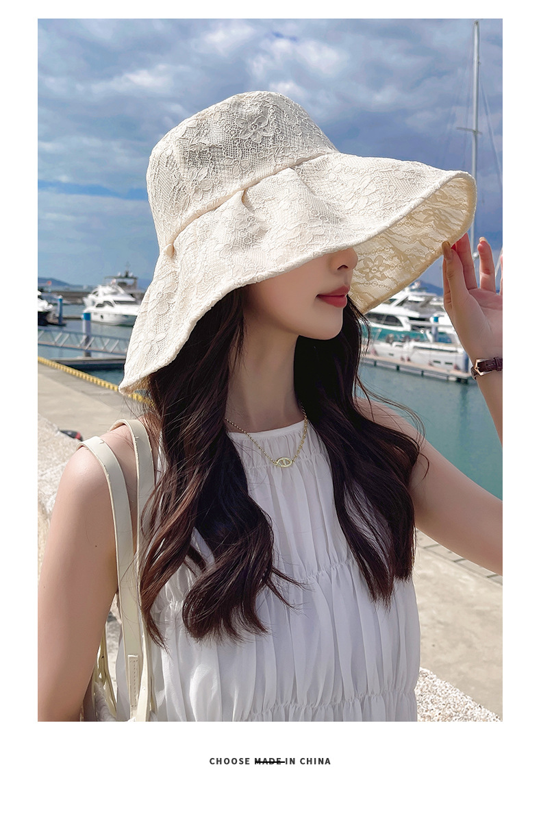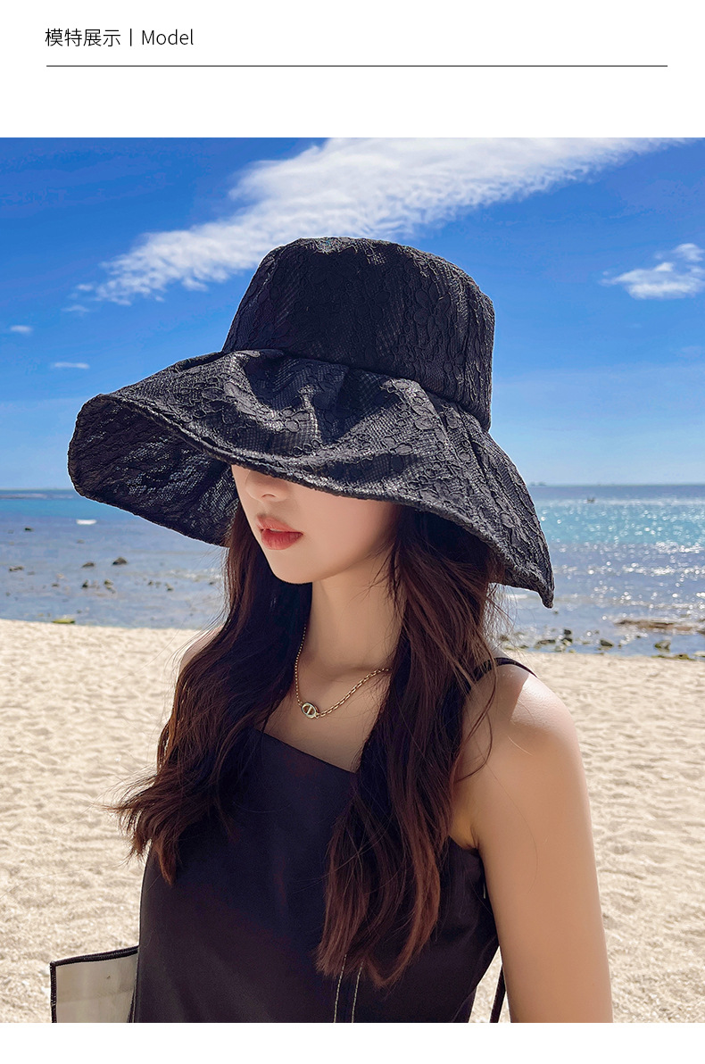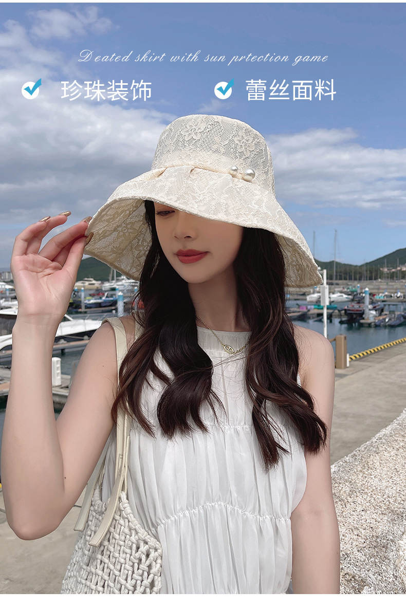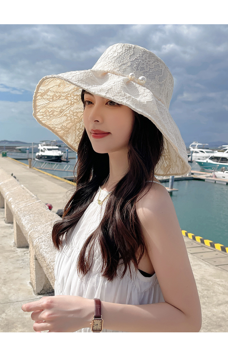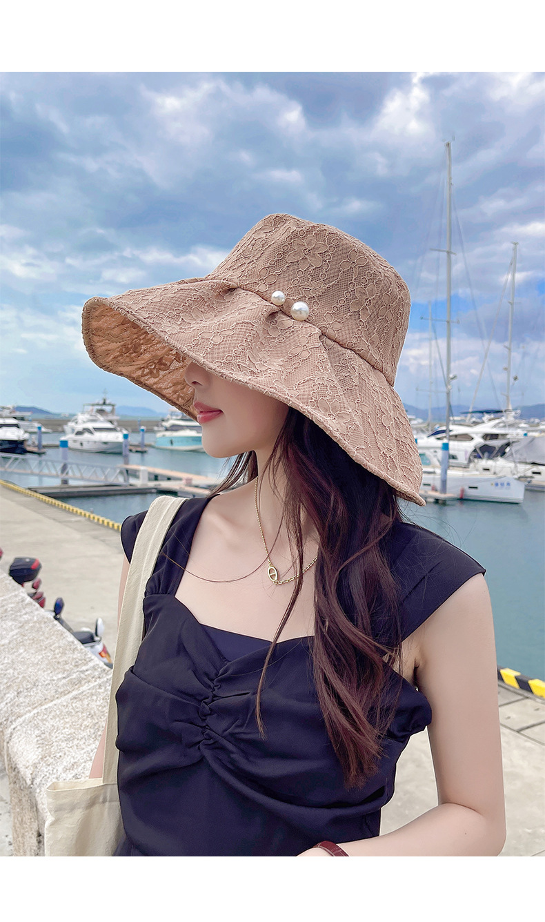 Wholesale of fisherman hats, women's large brim Korean UV sun protection hats, foldable pearl lace hats, summer sun protection hats