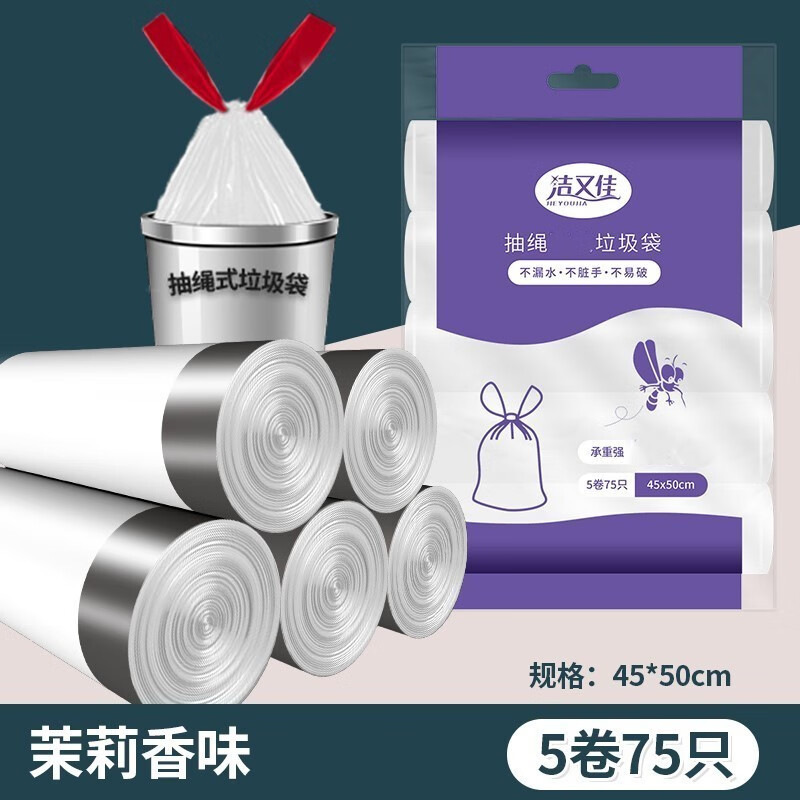 There are 75 pieces in total, 5 thick rolls of 45*50 white jasmine flower drawstring