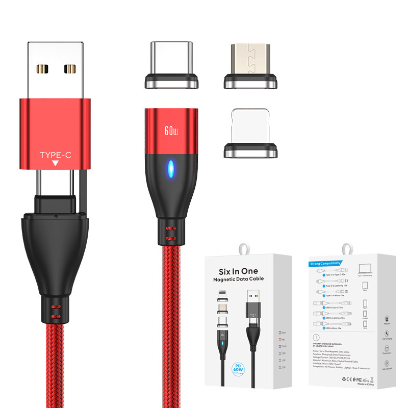 Wholesale of PD60W fast charging 6-in-1 magnetic data cable, aluminum alloy TPE nylon braided lamp mobile phone charging cable