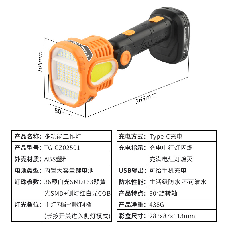 Wholesale of rechargeable outdoor portable lamps, flashlights, COB camping lamps with built-in USB charging, multi-functional camping work lights