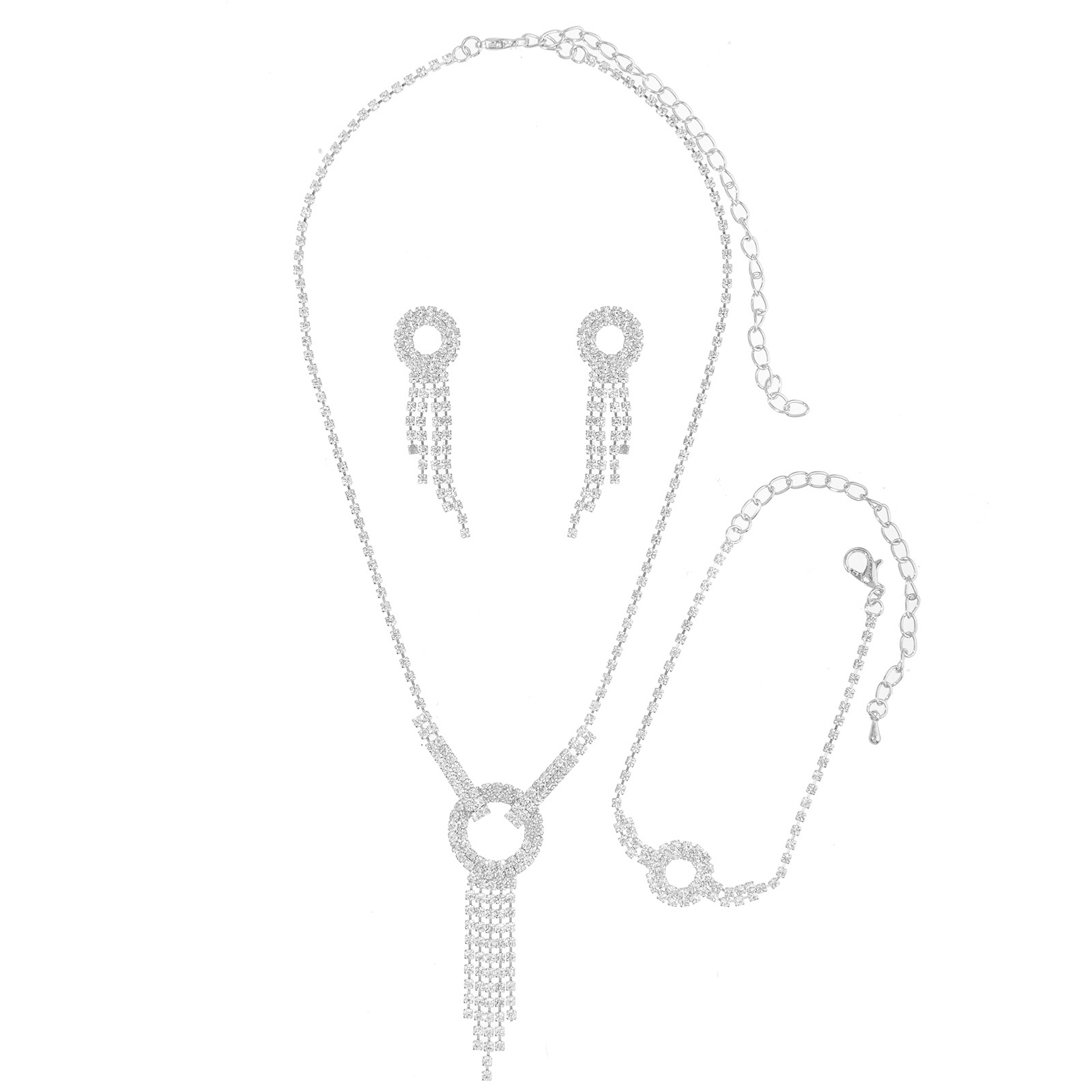 Wholesale supply of cross-border chain, rhinestone, tassel, necklace, earrings, bracelet, luxury three-piece set, banquet dress and wedding accessories