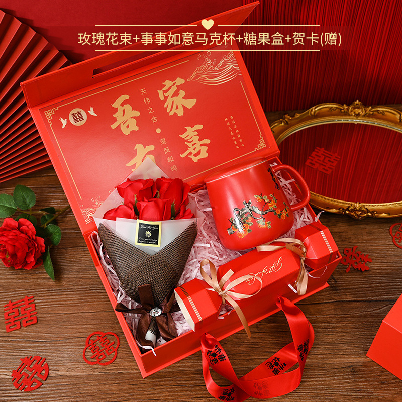 A three-piece set of bouquet of flowers, Warm Persimmons Cup and wedding candy box, with a red box of persimmons Bringing good fortune