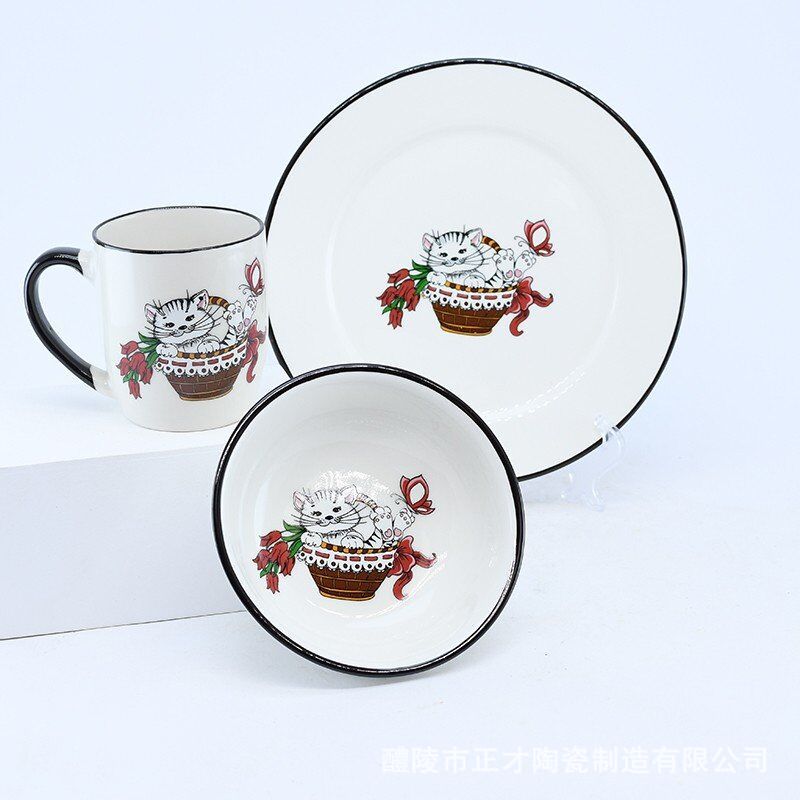 Wholesale white tableware cartoon three-piece sets of cups, bowls and plates in stock
