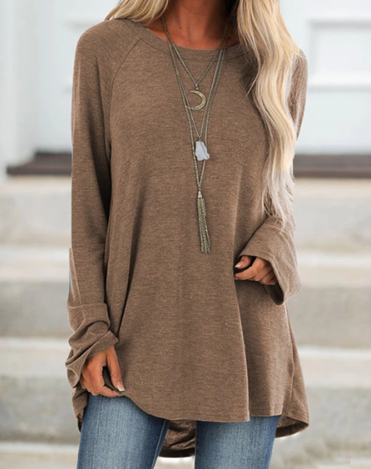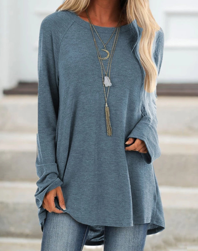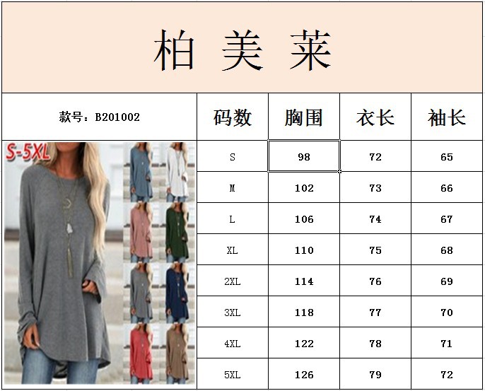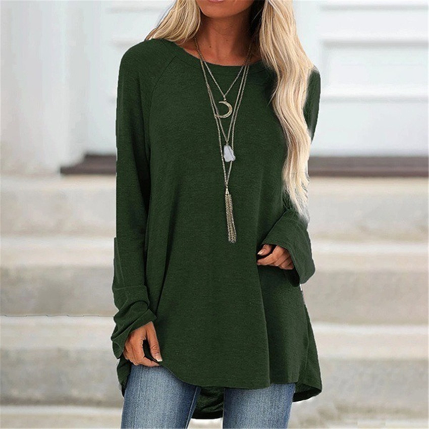 wish's autumn bestseller for cross-border women's clothing: solid-color casual large-sized round-neck loose long-sleeved pullover T-shirt, mid-length style