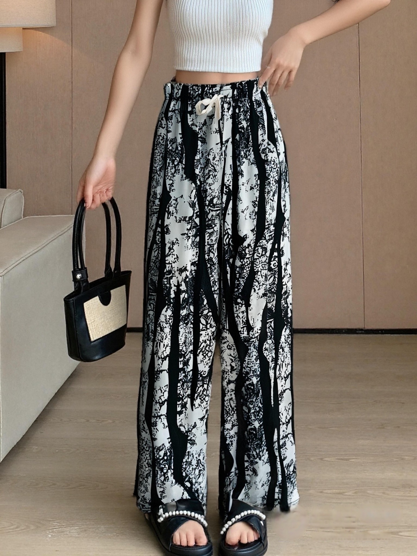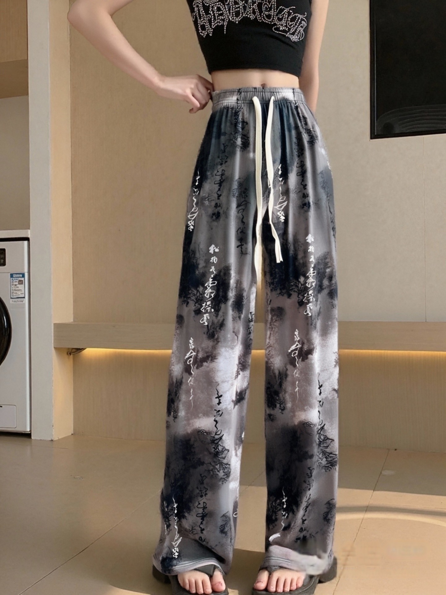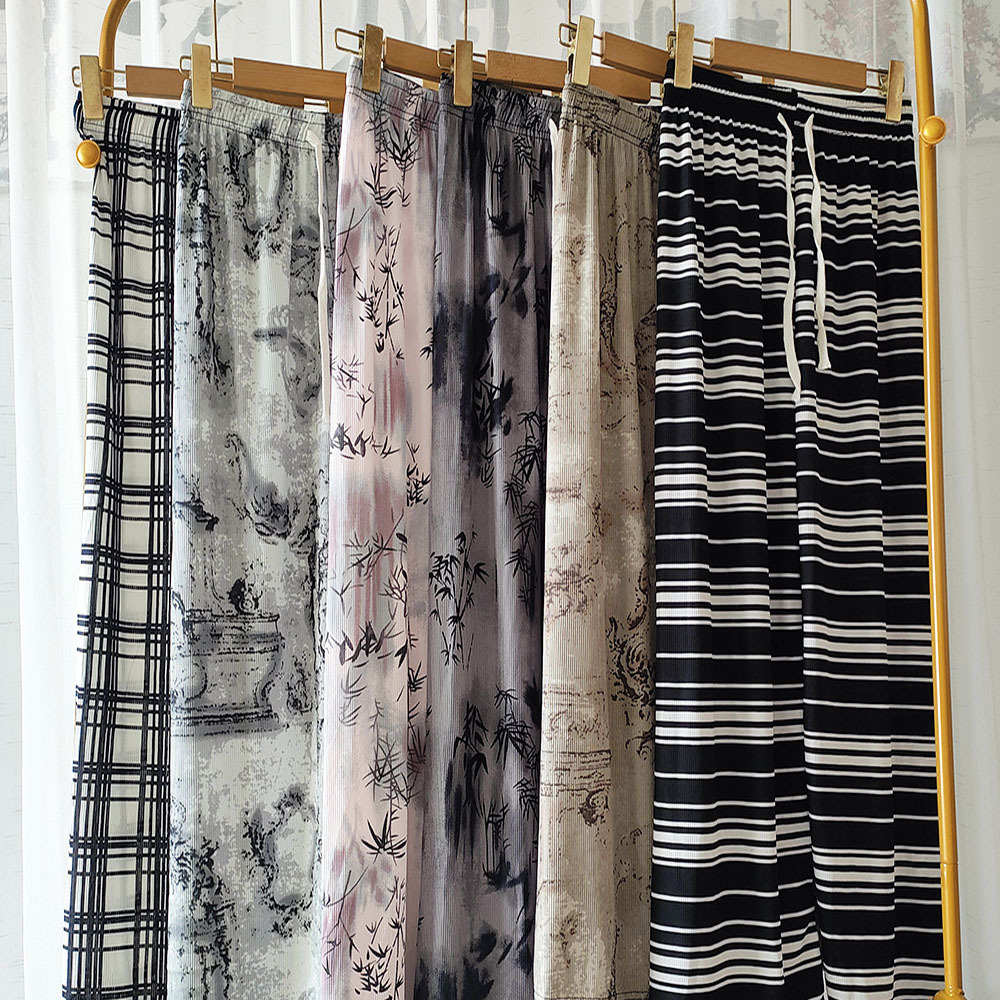 Women's pocket pocket new Chinese-style summer thin Chinese-style ink-wash printed draping ice silk wide-leg pants