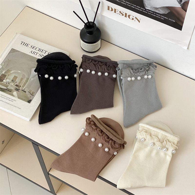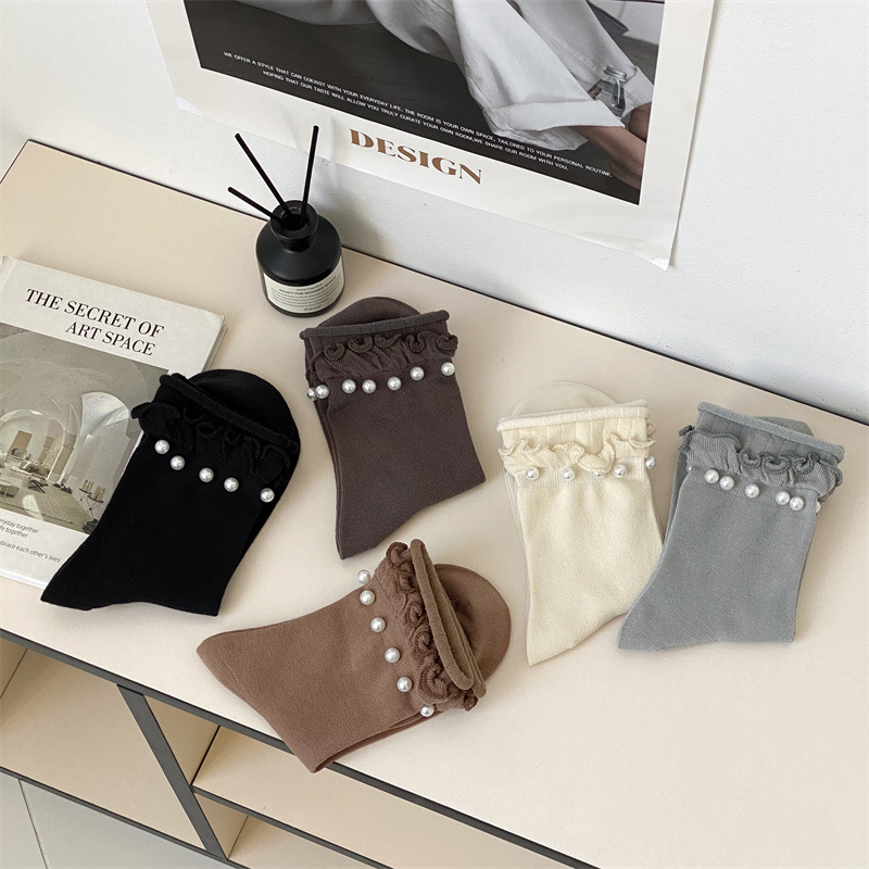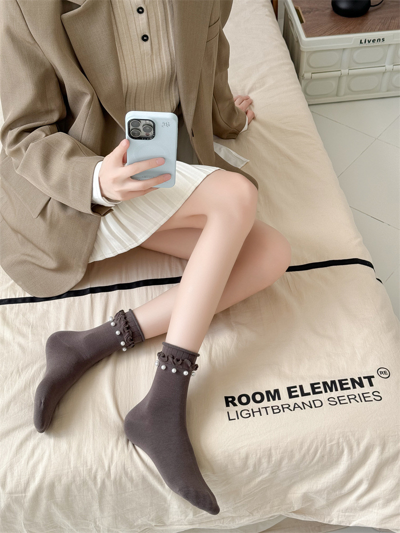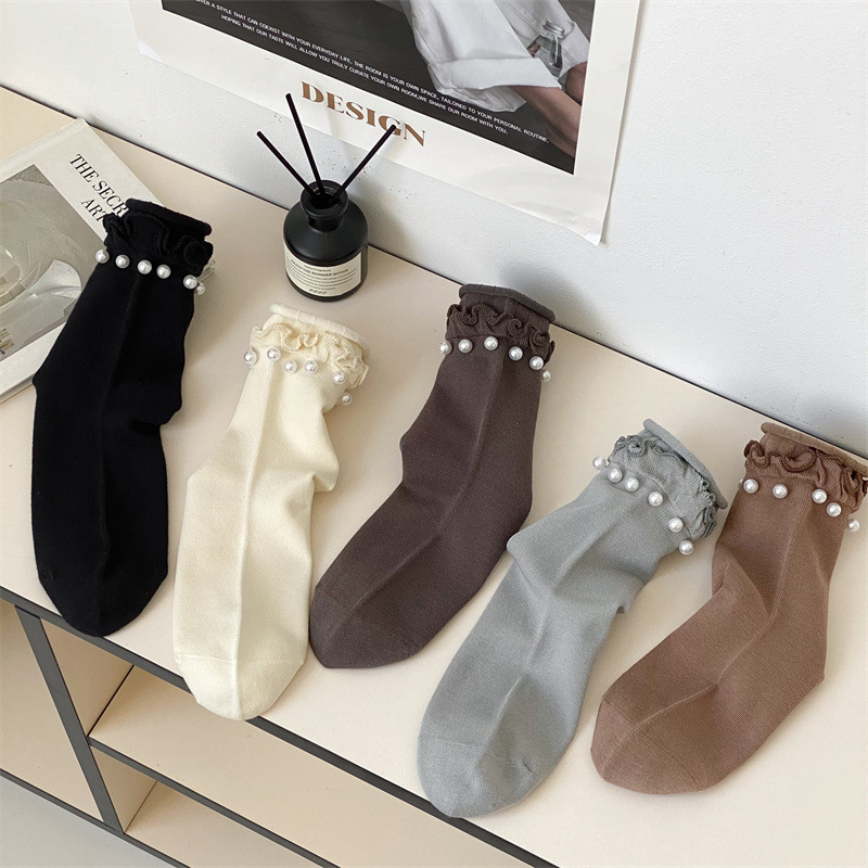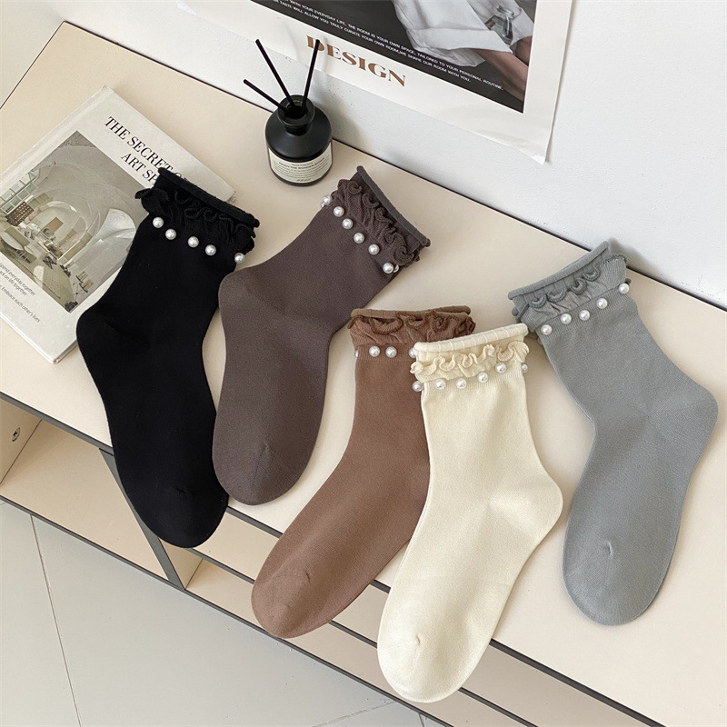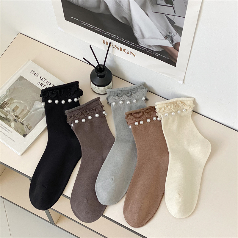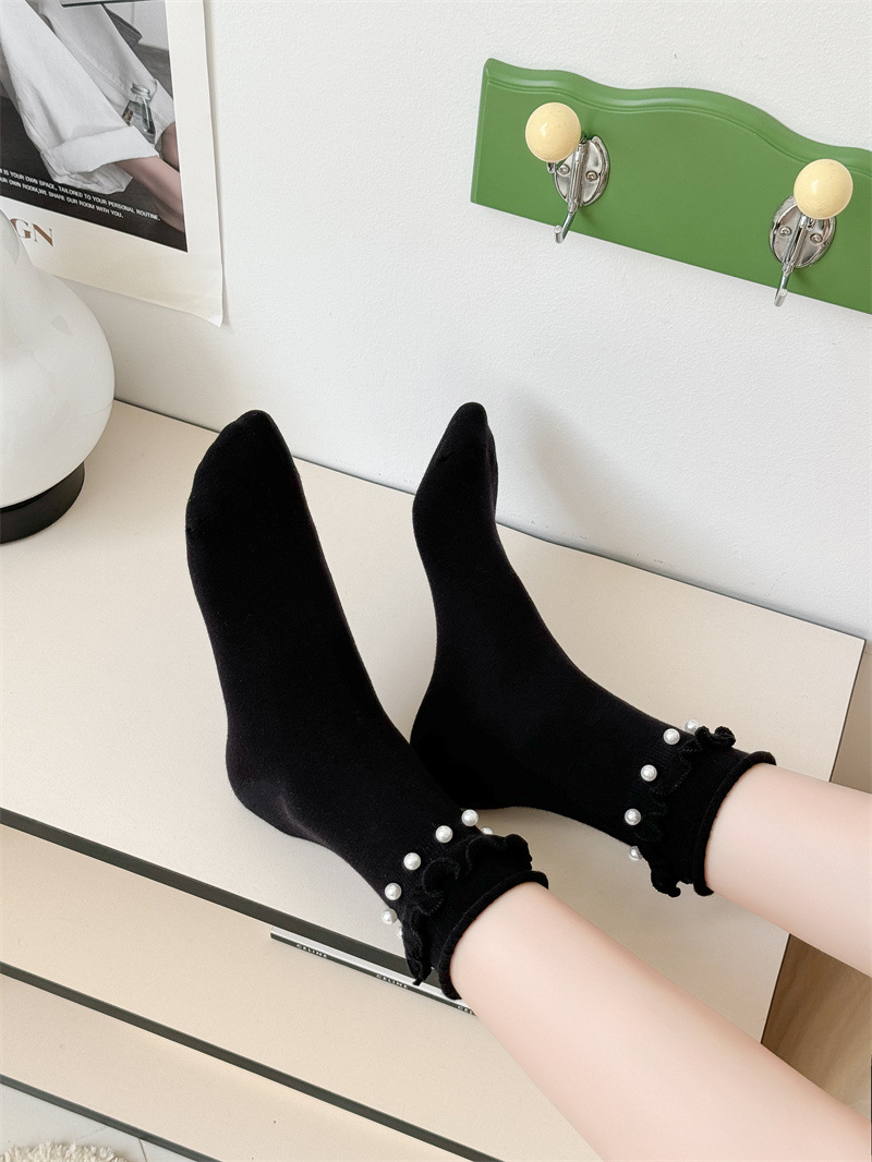 Women's socks, Japanese sweet lace socks, ins trendy Korean black fungus fringed beaded rolled-up mid-calf socks, cotton socks wholesale
