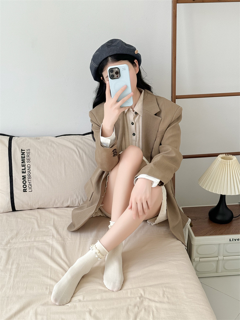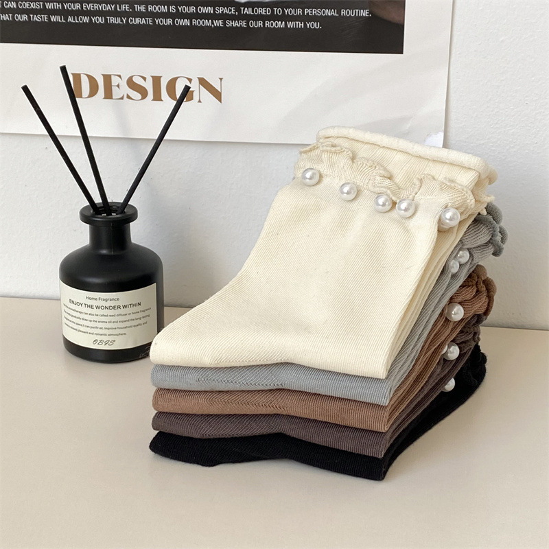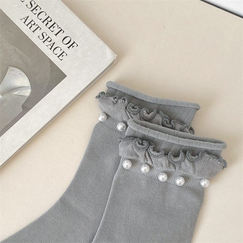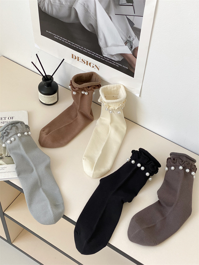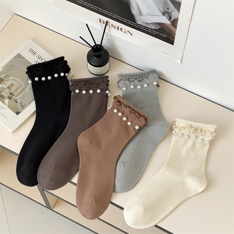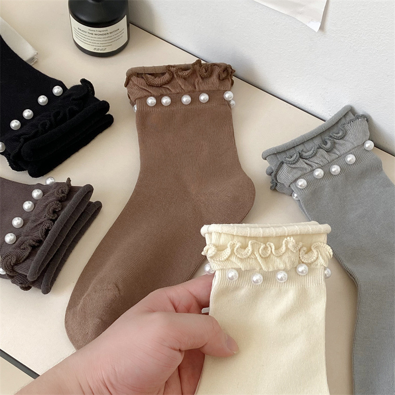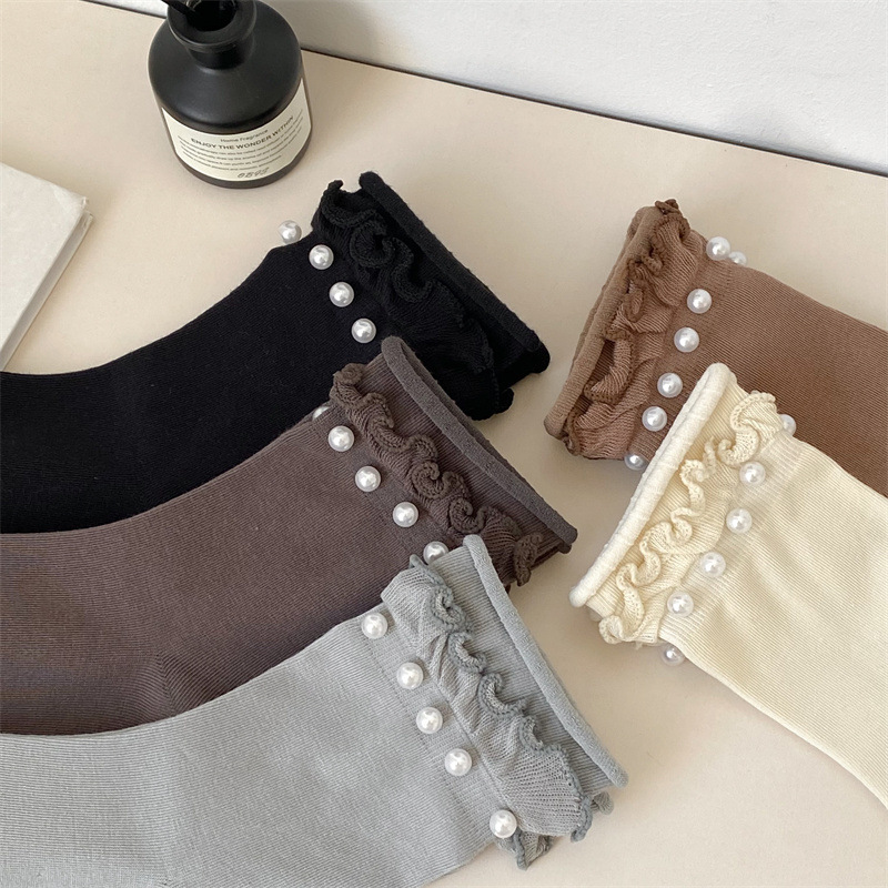 Women's socks, Japanese sweet lace socks, ins trendy Korean black fungus fringed beaded rolled-up mid-calf socks, cotton socks wholesale