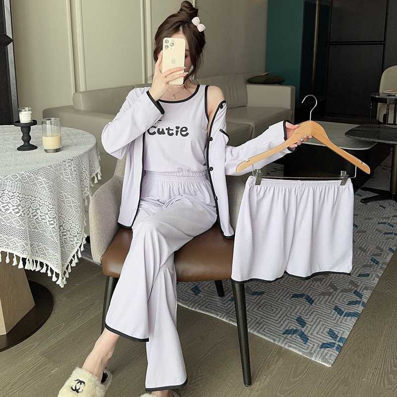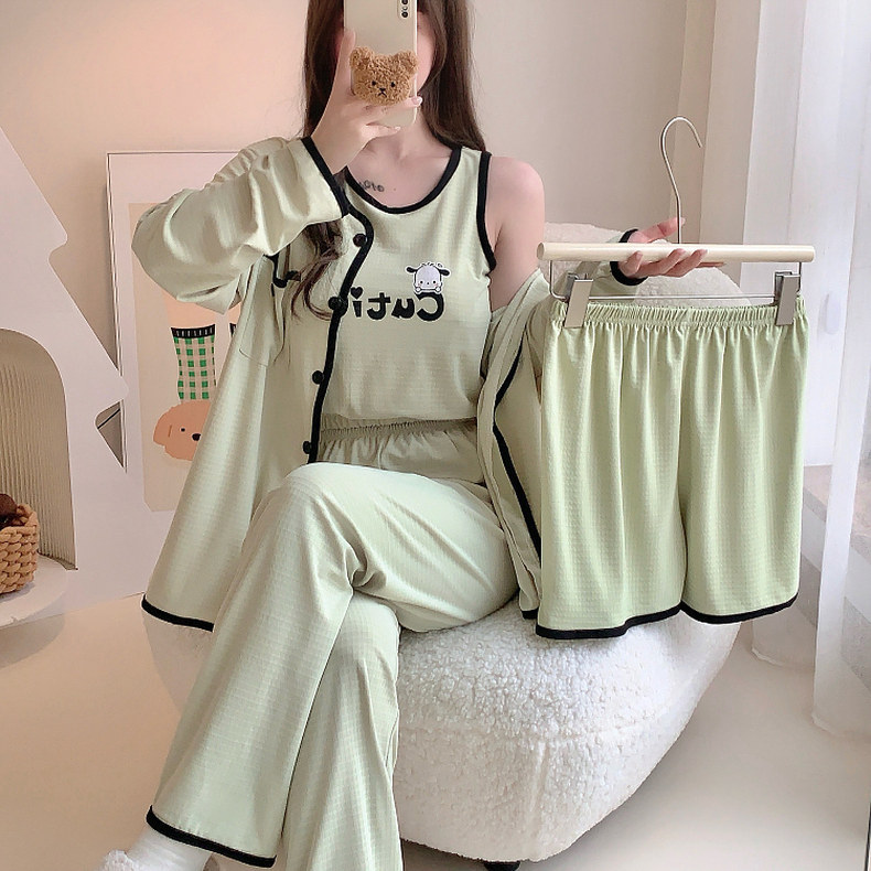Women's spring and autumn long-sleeved four-piece set with chest cushion pajamas, summer halter top, cute cartoon 2024 new style home wear