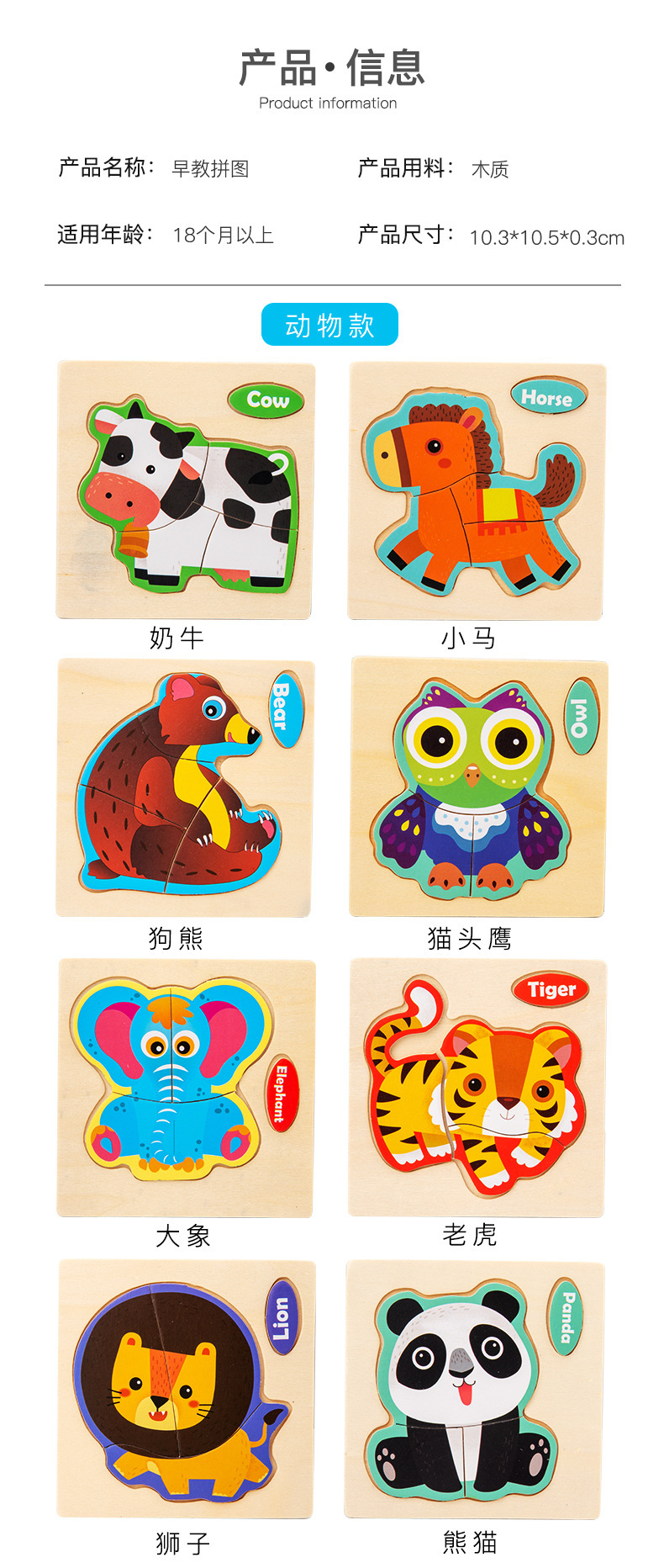 Manufacturer's wooden children's small 9-piece cartoon animal jigsaw puzzle and educational toy board for 2-3-4 years old