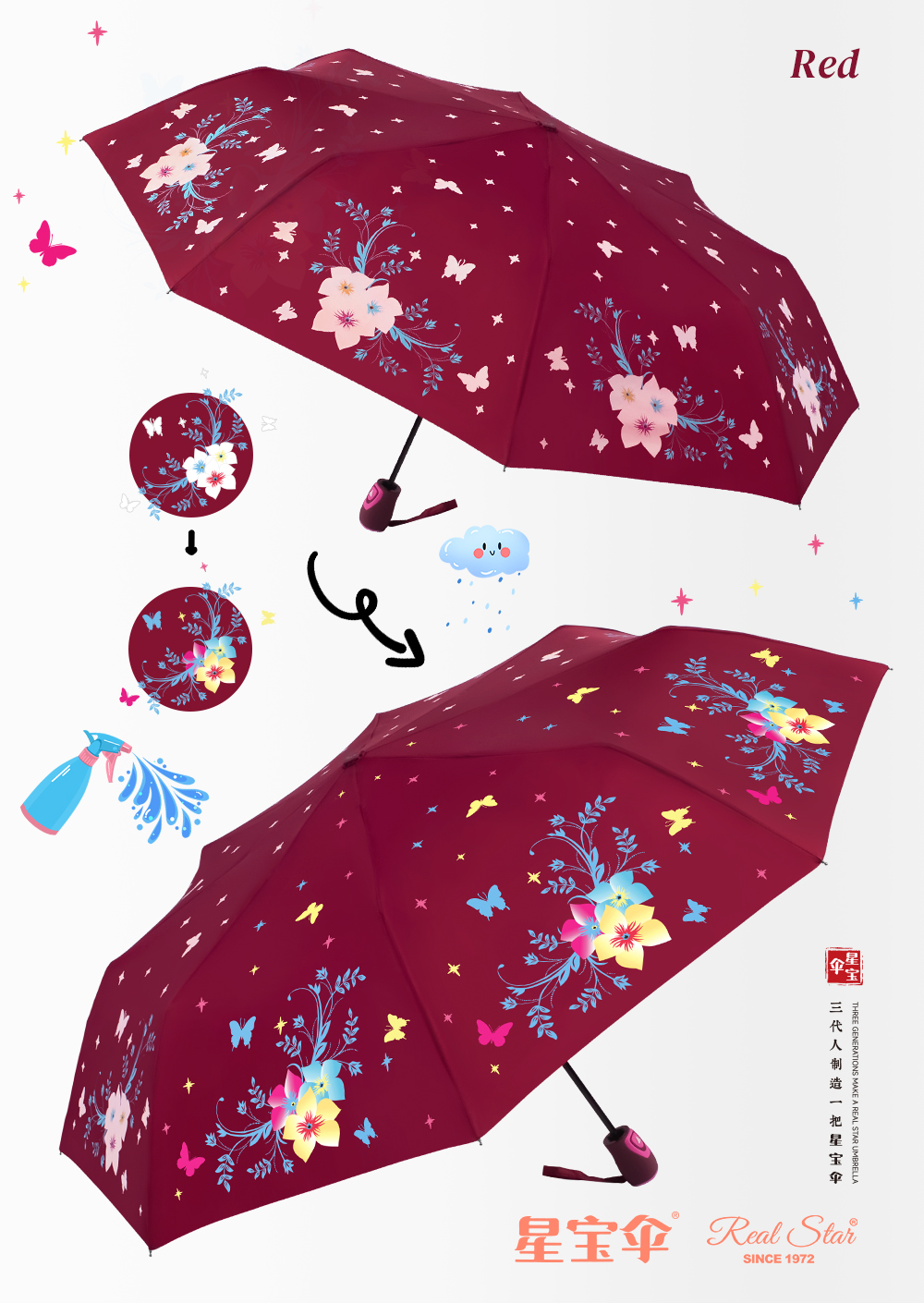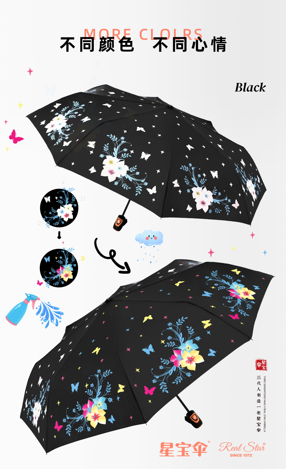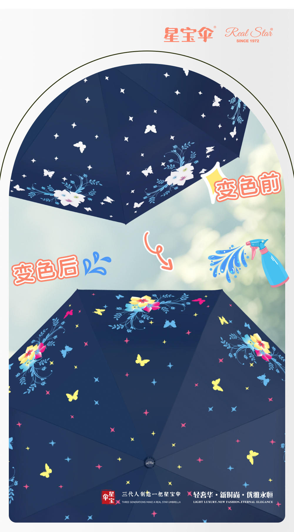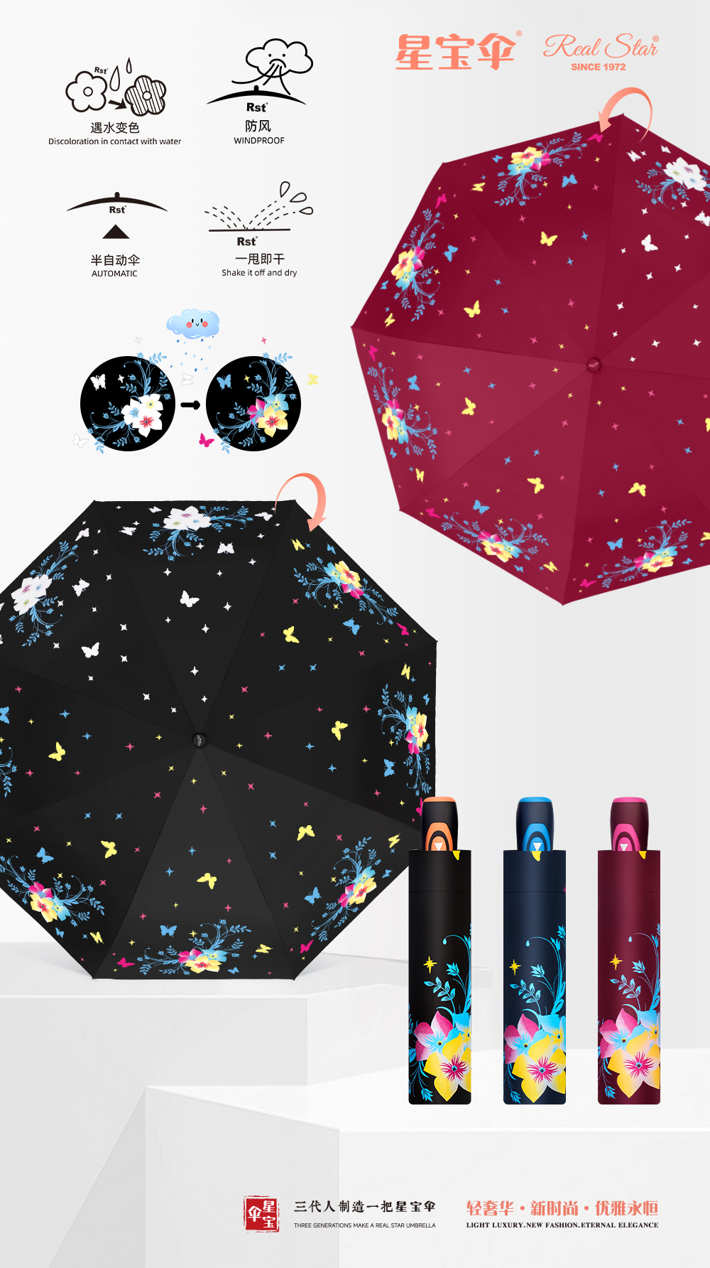 Xingbao Umbrella 3807A changes color when exposed to water, three-and-a-half-folding automatic umbrella, windproof umbrella, color-changing umbrella, women's umbrella, flower color-changing innovative umbrella