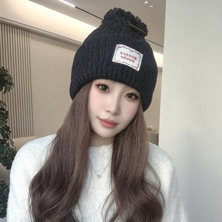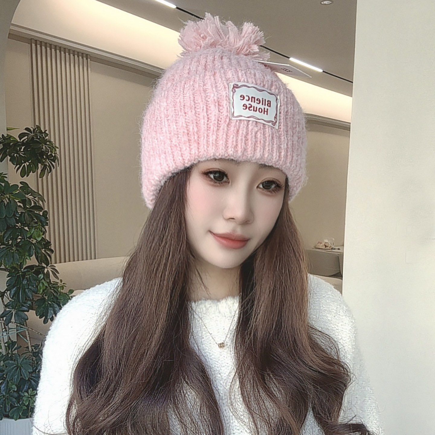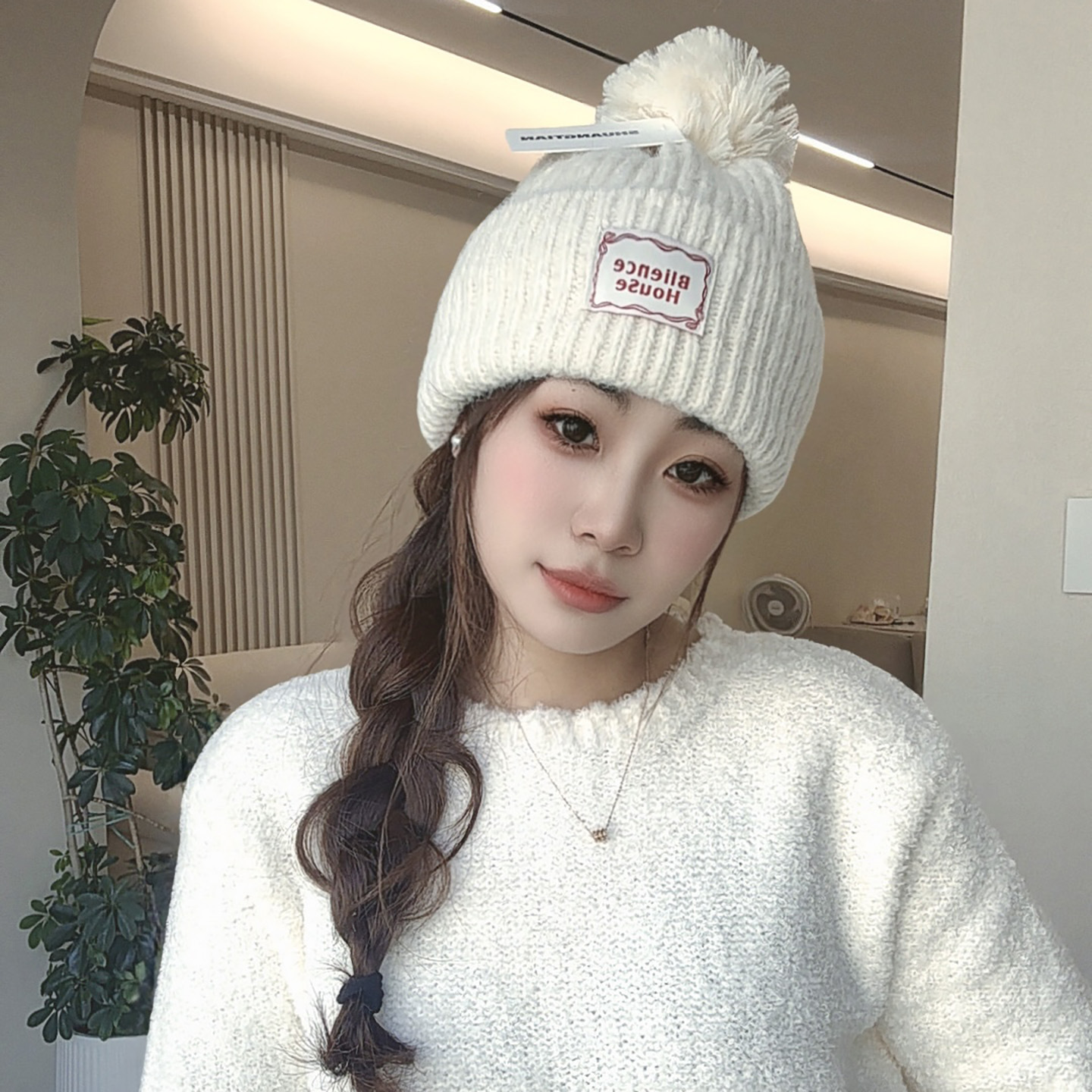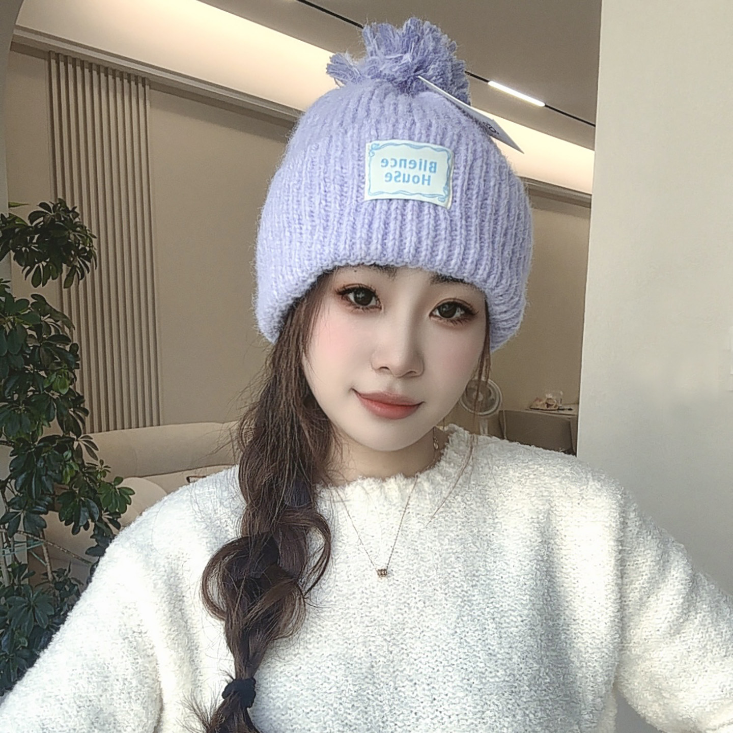 Yellow pom-pom knitted woolen cap for women's autumn and winter headwear, warm pullover cap, face-making small and cold-proof headscarf