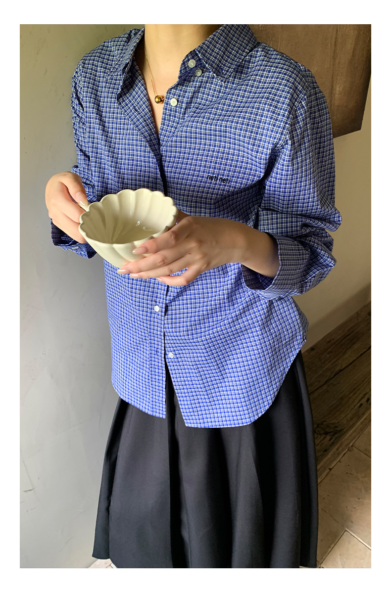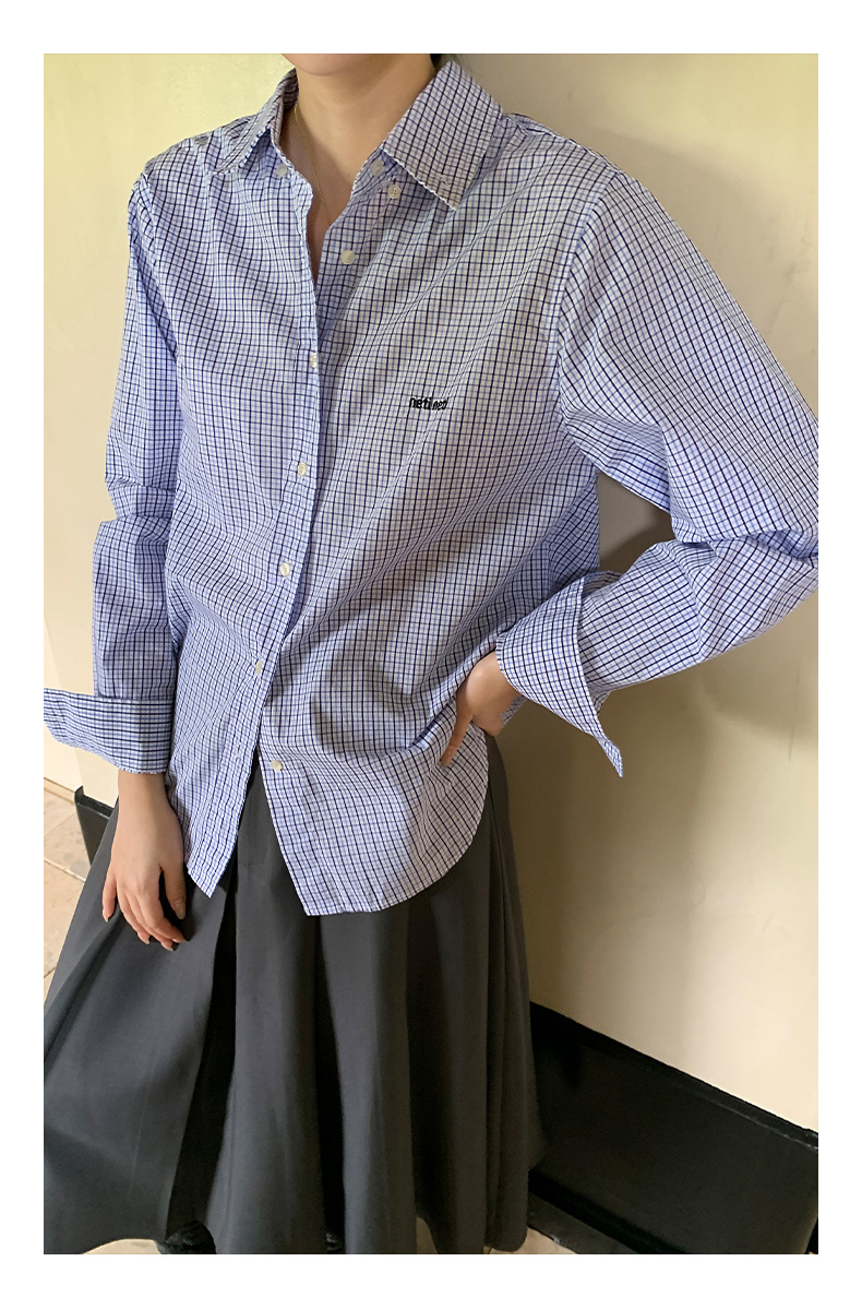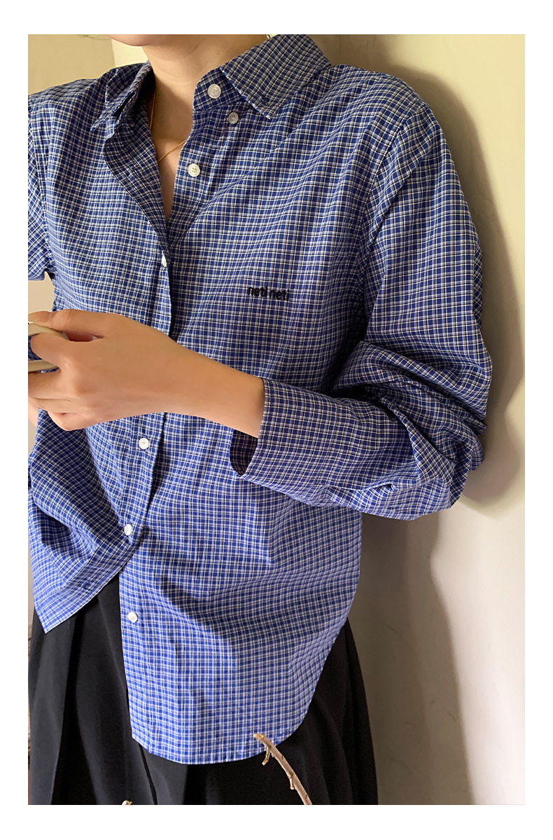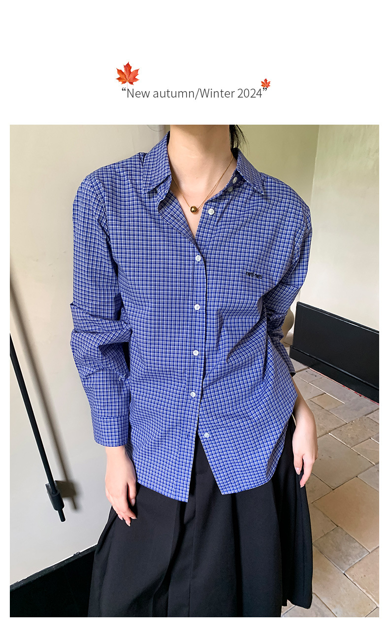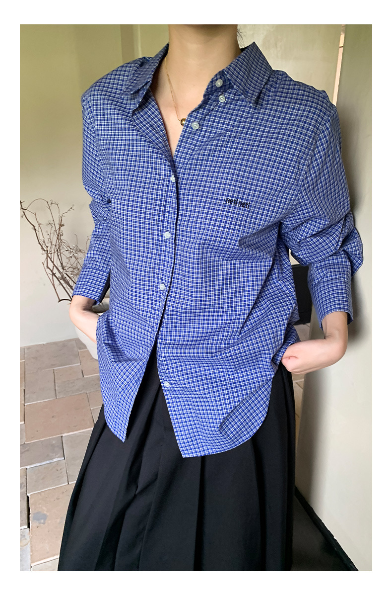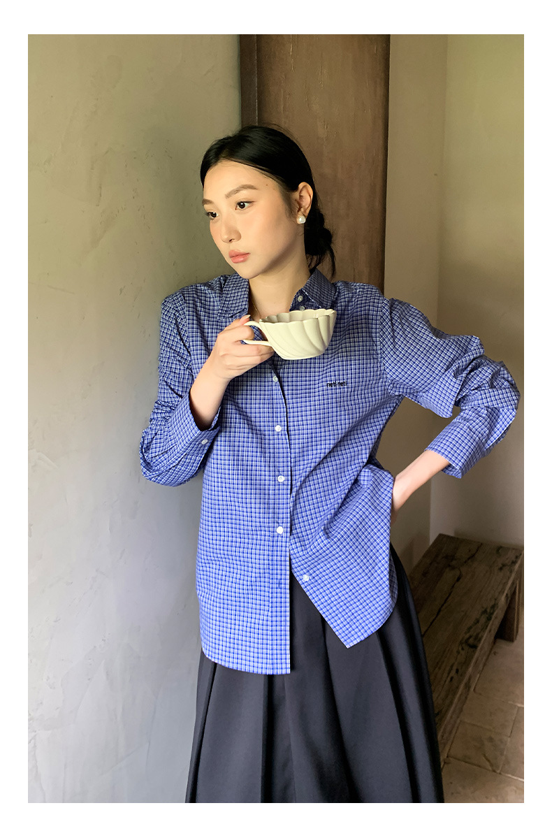 "Yiershan Korean style MIU style Teng Jie Dongdaemun Plain checkered shirt Women long-sleeved lapel cotton shirt.