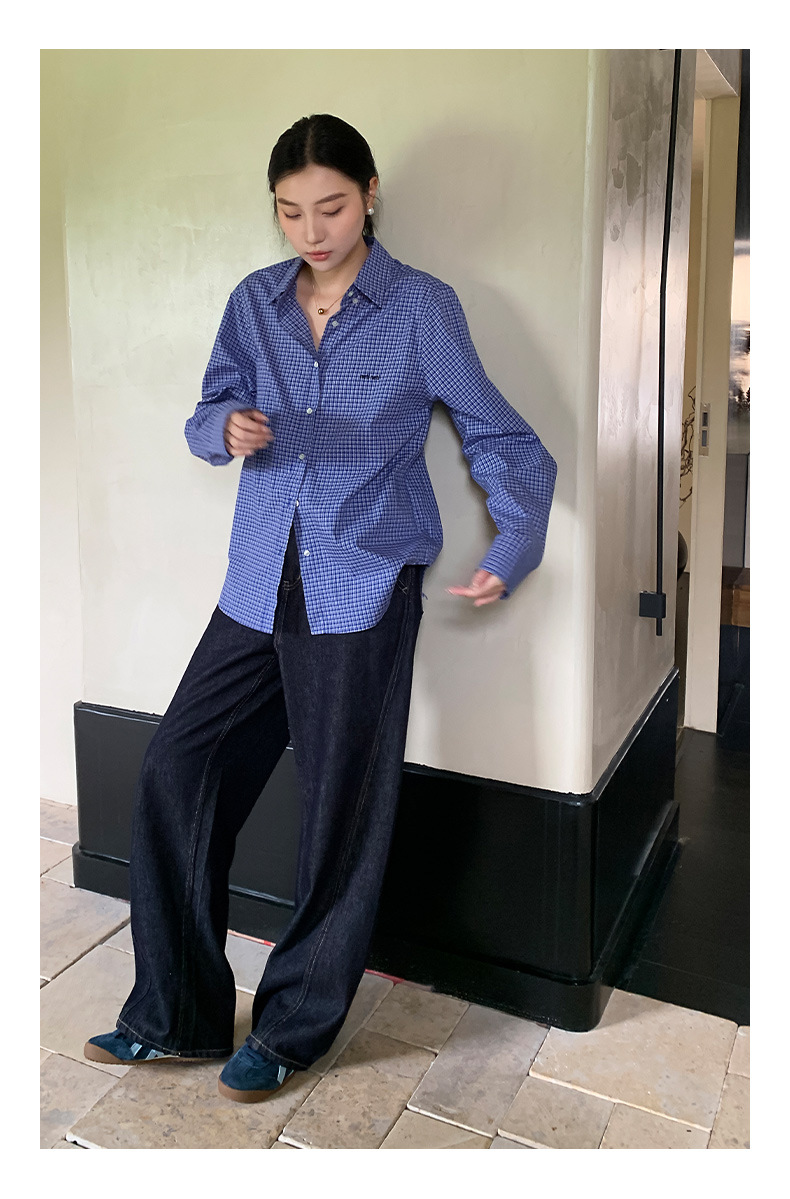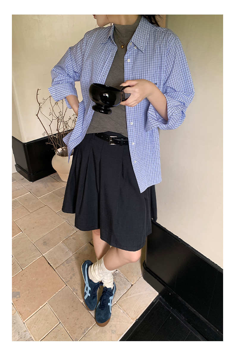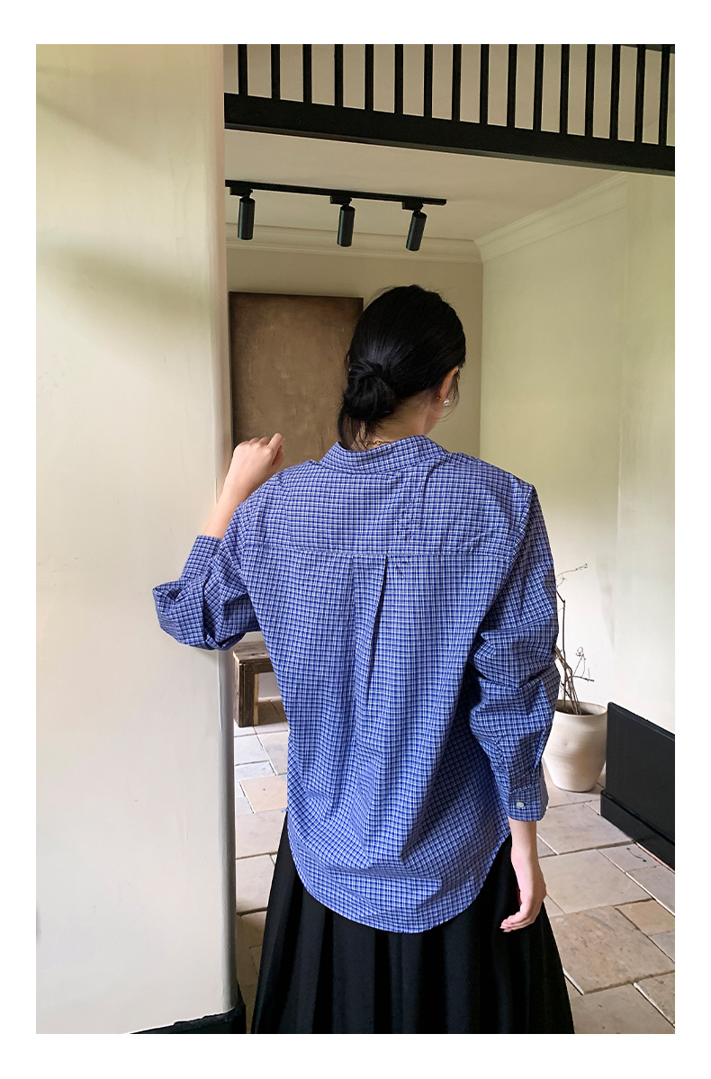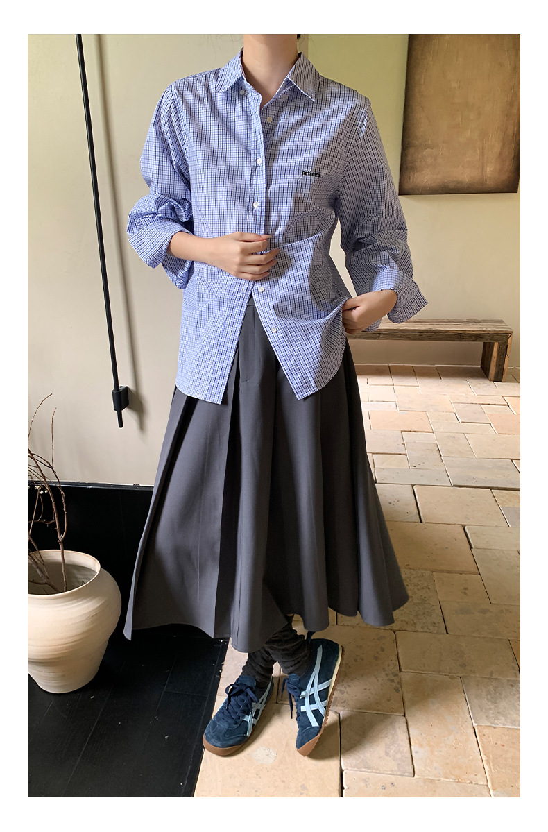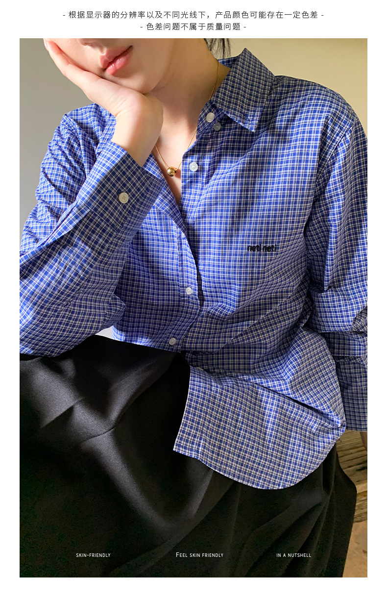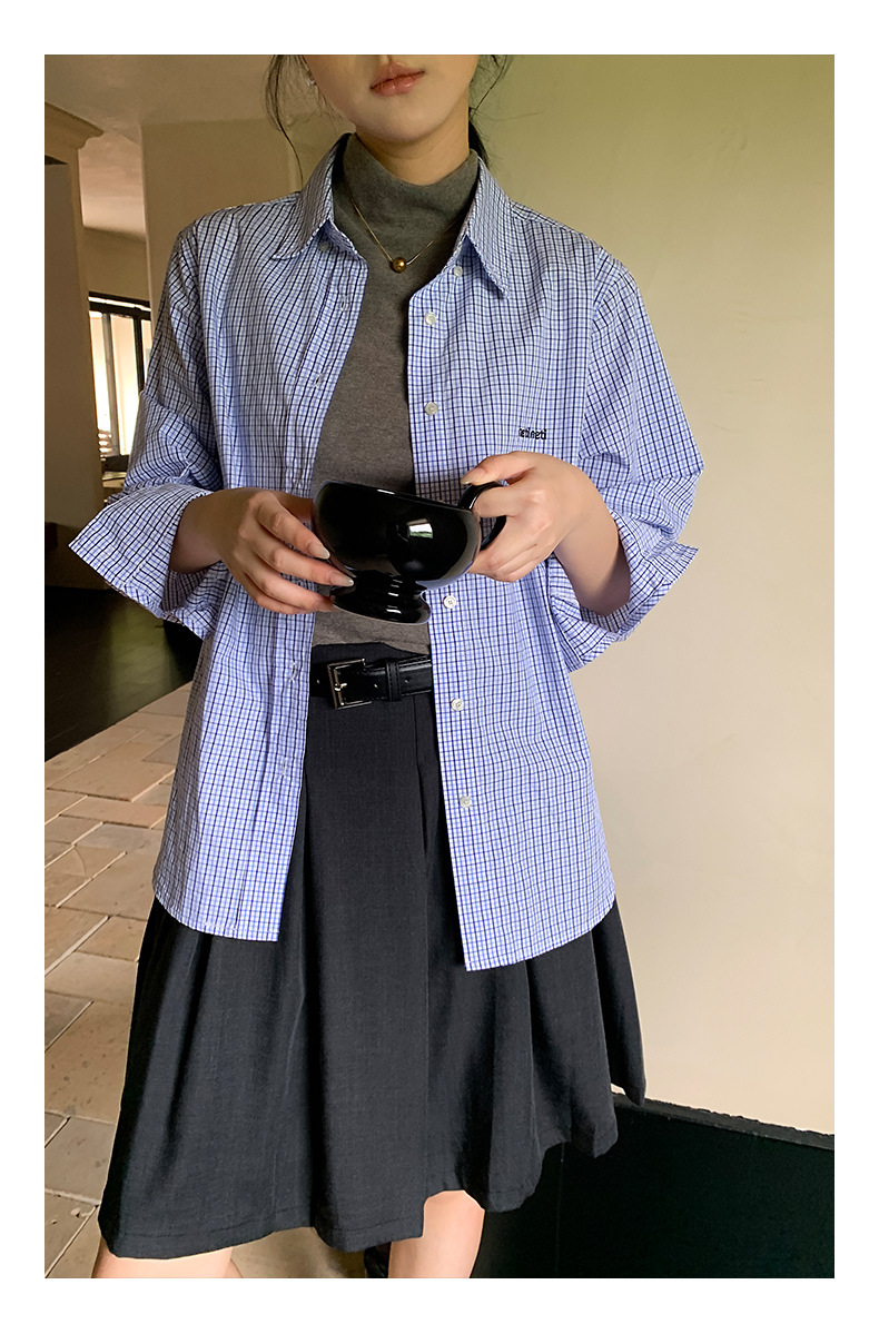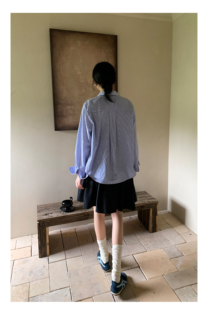 "Yiershan Korean style MIU style Teng Jie Dongdaemun Plain checkered shirt Women long-sleeved lapel cotton shirt.