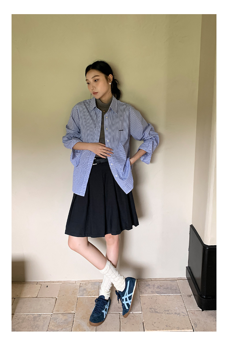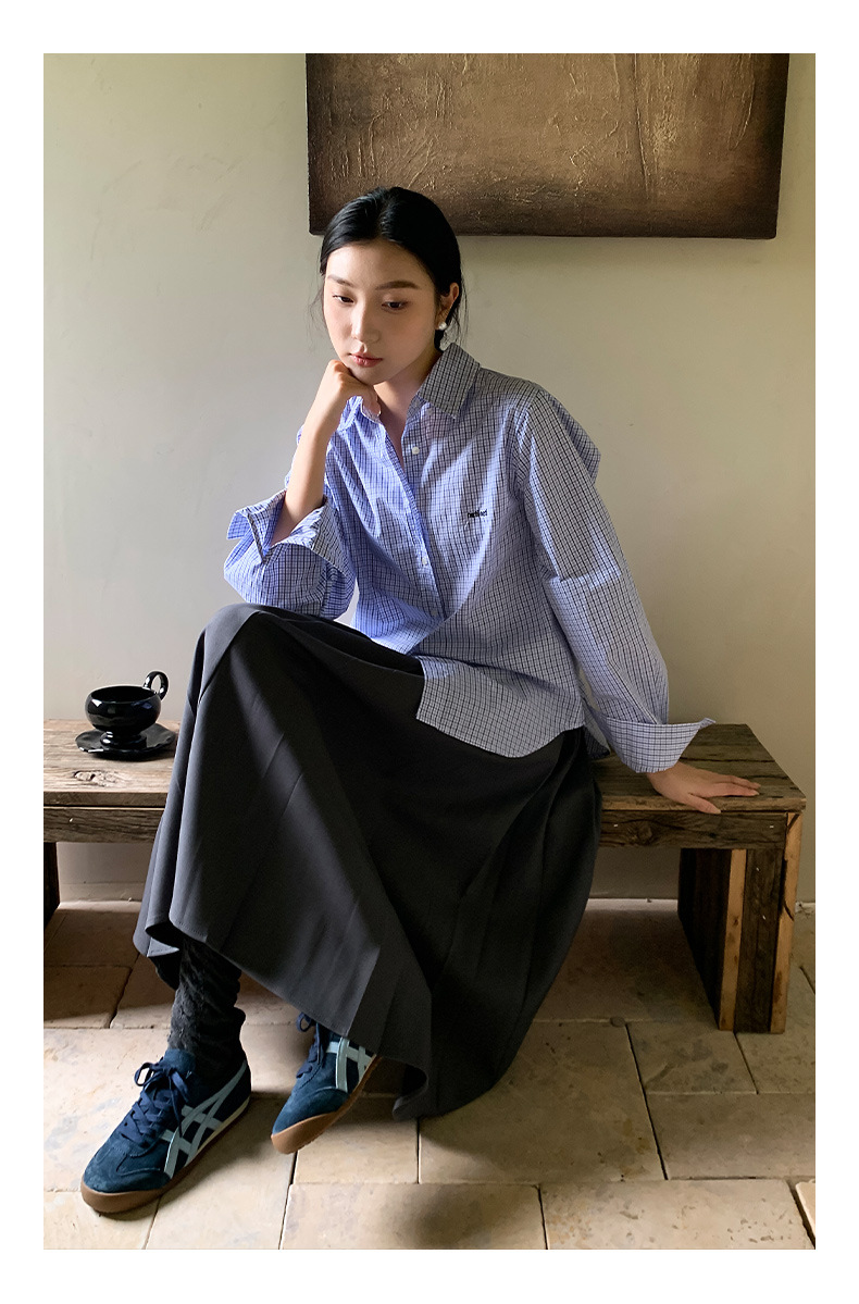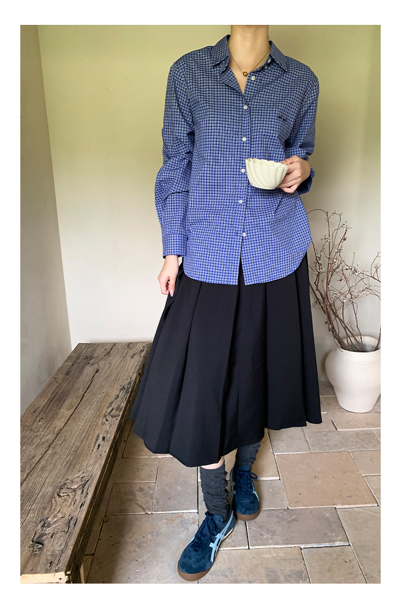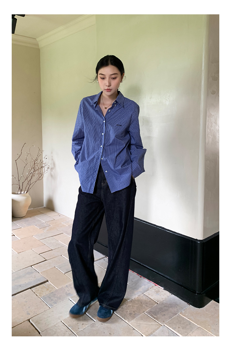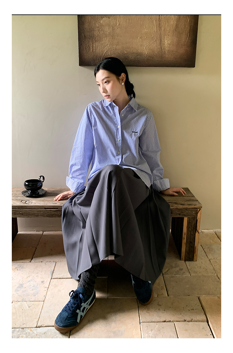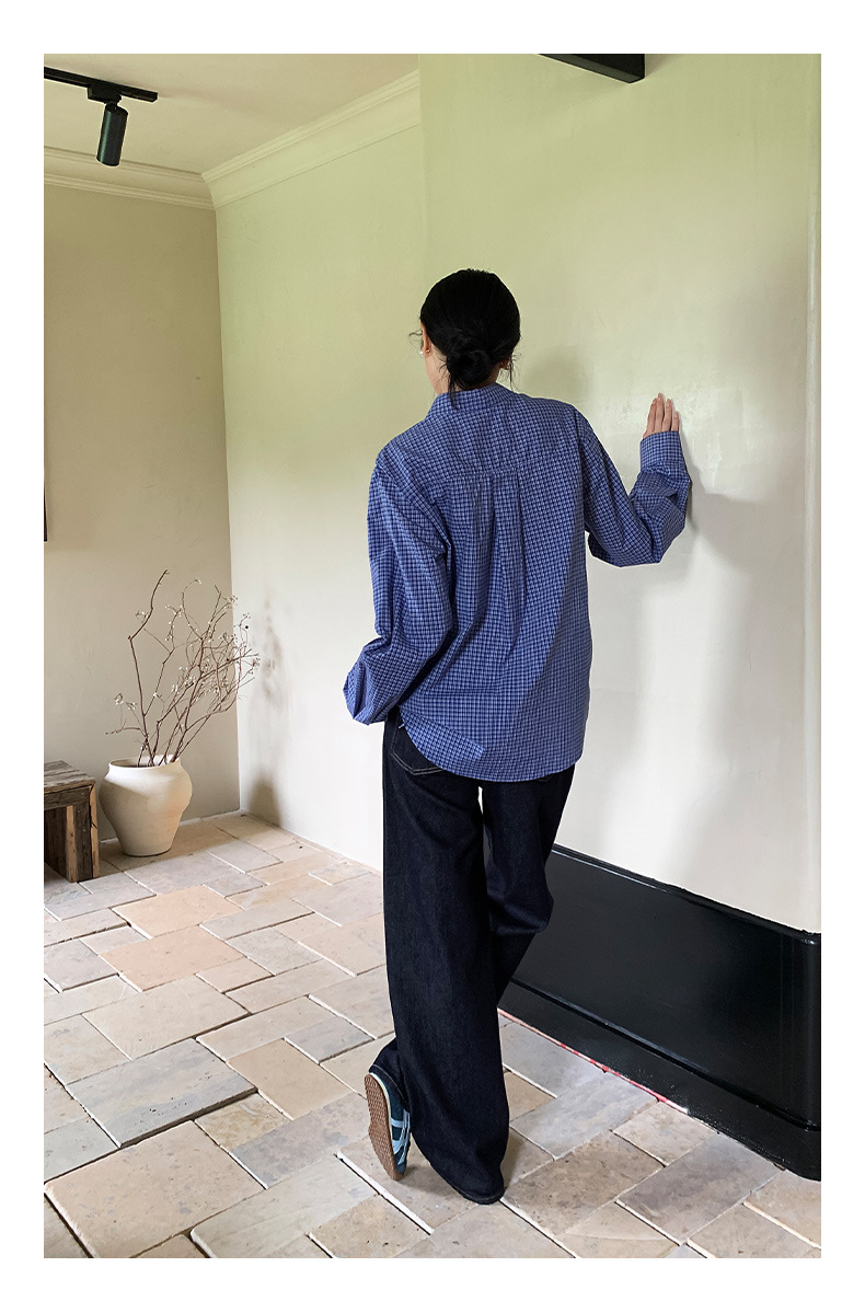 "Yiershan Korean style MIU style Teng Jie Dongdaemun Plain checkered shirt Women long-sleeved lapel cotton shirt.