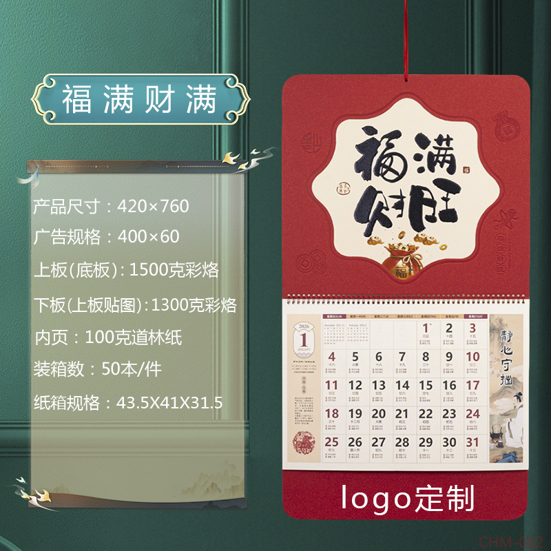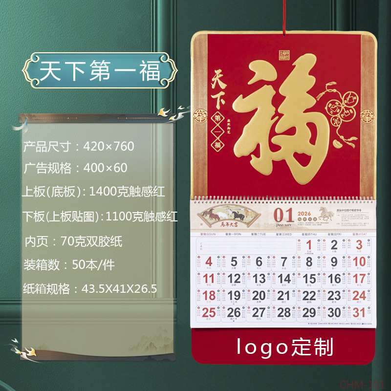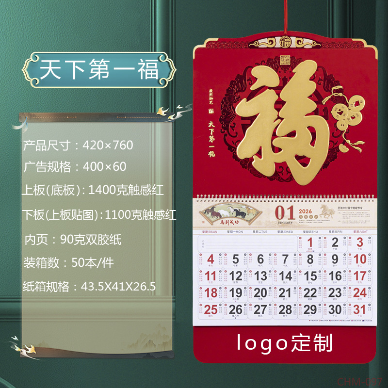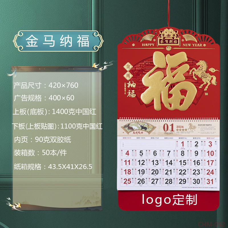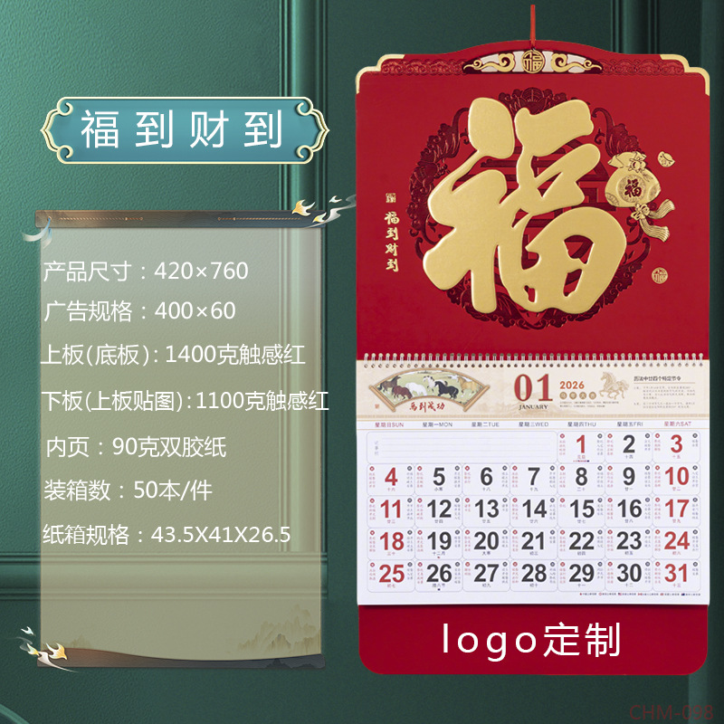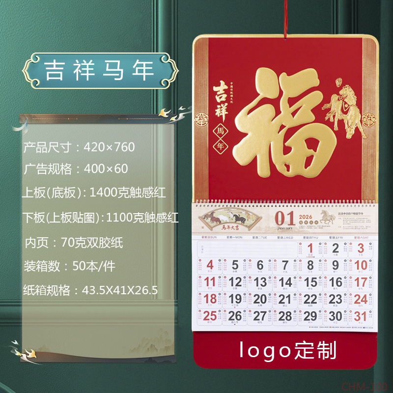 Zhouzhou Calendar 2026 Year of the Horse Lunar New Year's Day, Colorful logo Art Fortune Plaque, Touch Gold Carving Craftsmanship Advertising Pendant Calendar