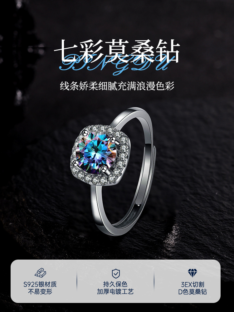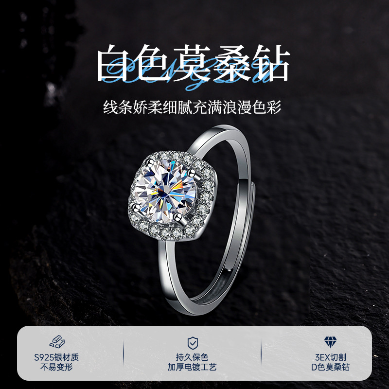 Zhuoheng Select 925 sterling silver ring, non-fading, niche design, simple square bag, moissanite opening adjustable, non-fading